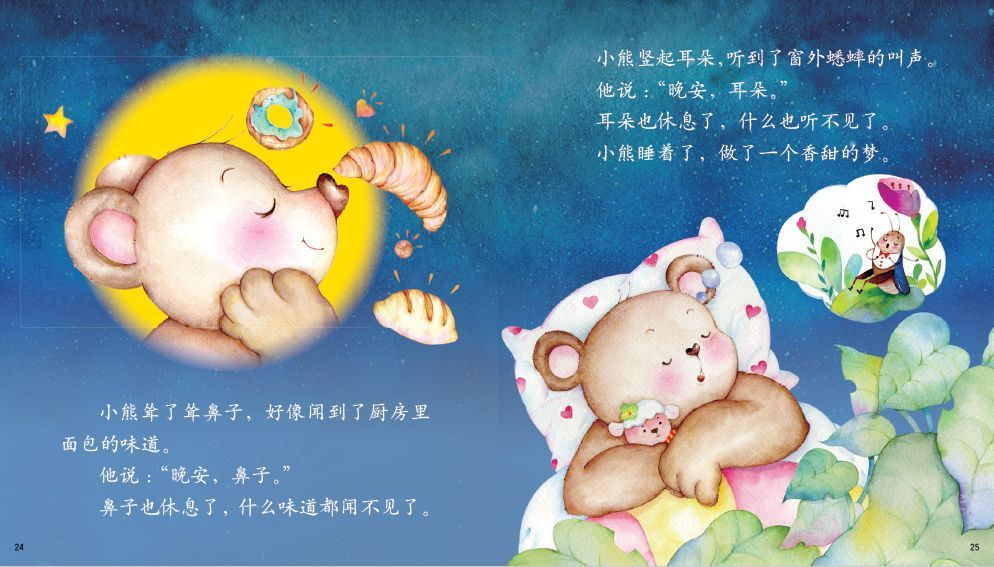 天黑了,该睡觉了,可是小熊却睡不着。妈妈说:“你可以对身体说晚安,让它们安静下来,就能睡着了。”
