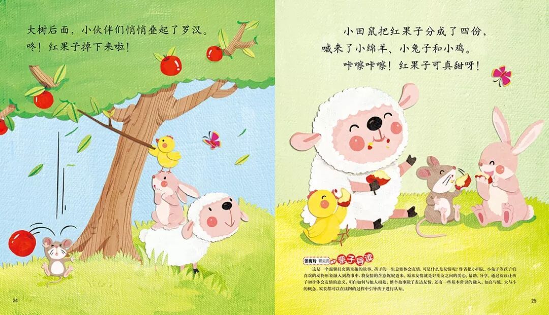 小田鼠把红果子分成了四份,喊来了小绵羊、小兔子和小鸡。
