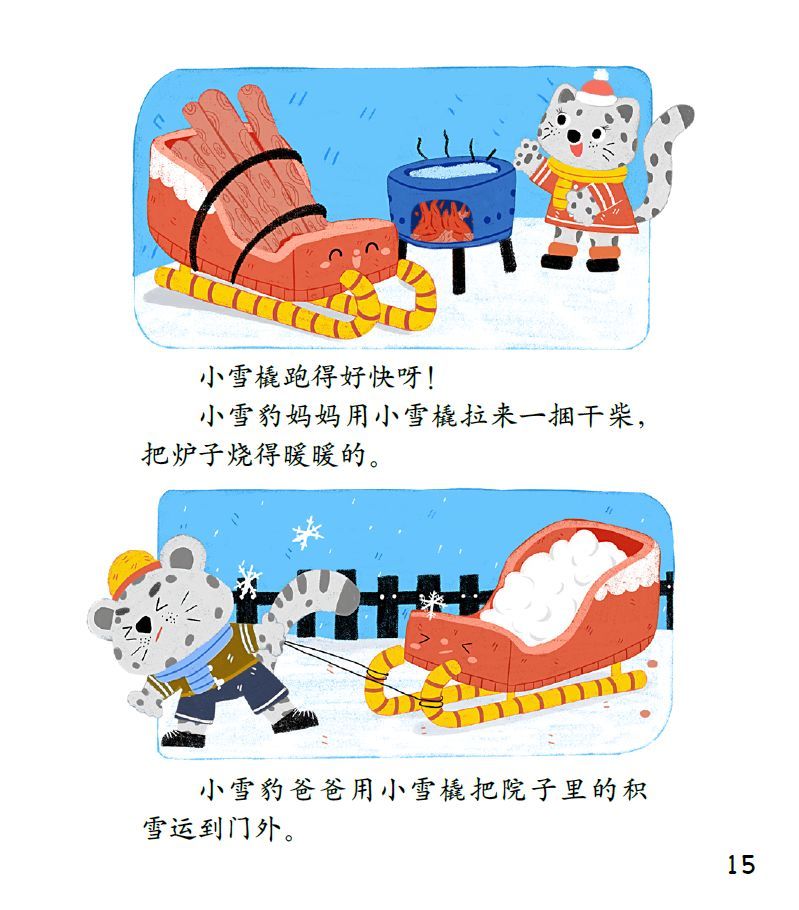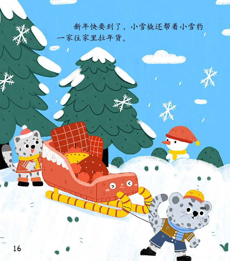新年快要到了,小雪橇还帮着小雪豹一家往家里拉年货。