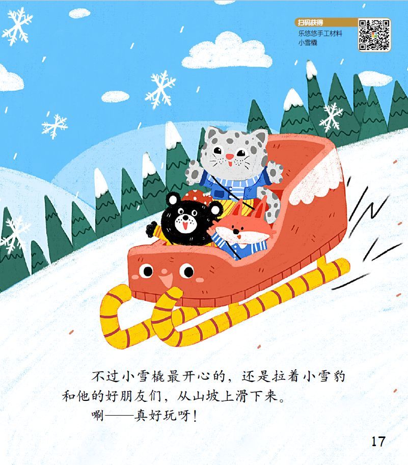 不过小雪橇最开心的,还是拉着小雪豹和他的好朋友们,从山坡上滑下来。