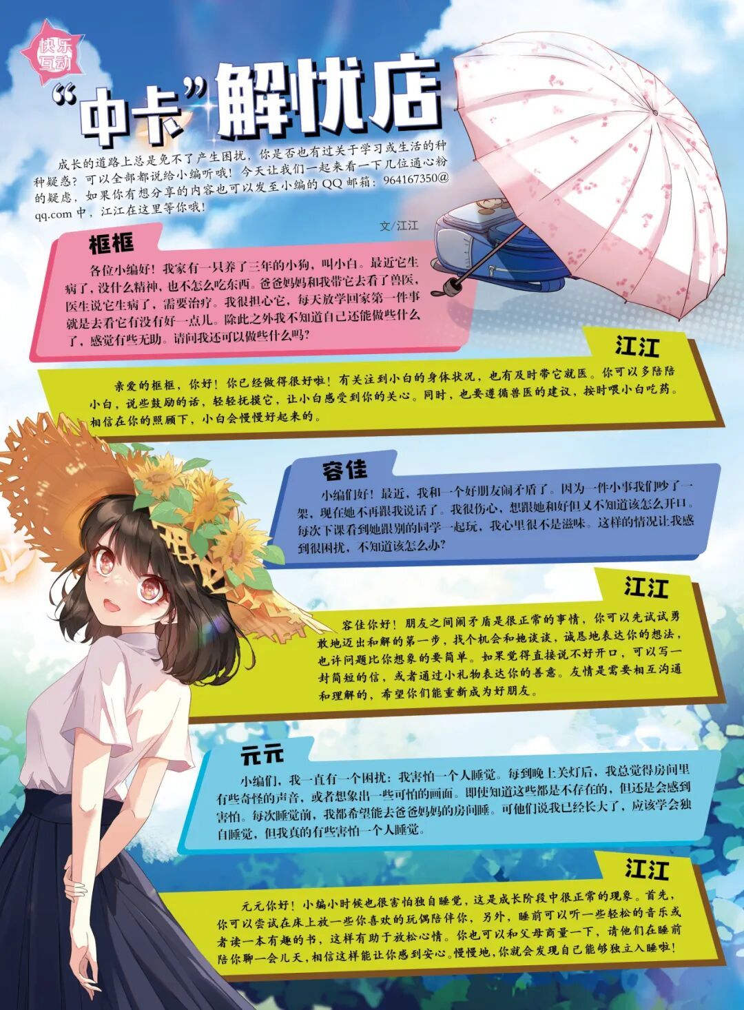 《中国卡通》精心开辟读编互动环节,小读者可以向编辑姐姐们倾诉学习和成长过程中的烦恼、分享生活中的趣事、表达自己的想法、展示自己的作品,在这里获得真诚的理解与温暖的陪伴。