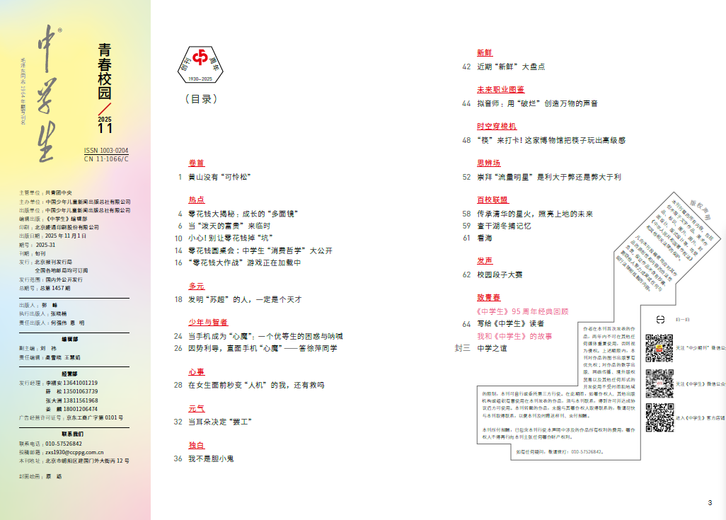 《中学生》(青春校园)11月“热点”栏目,带你揭秘零花钱背后的成长密码!这里有同龄理财高手分享如何用30元玩转理财,更有实用“防坑指南”为你守护钱包!学会做金钱的主人,让零花钱照亮你的成长之路!