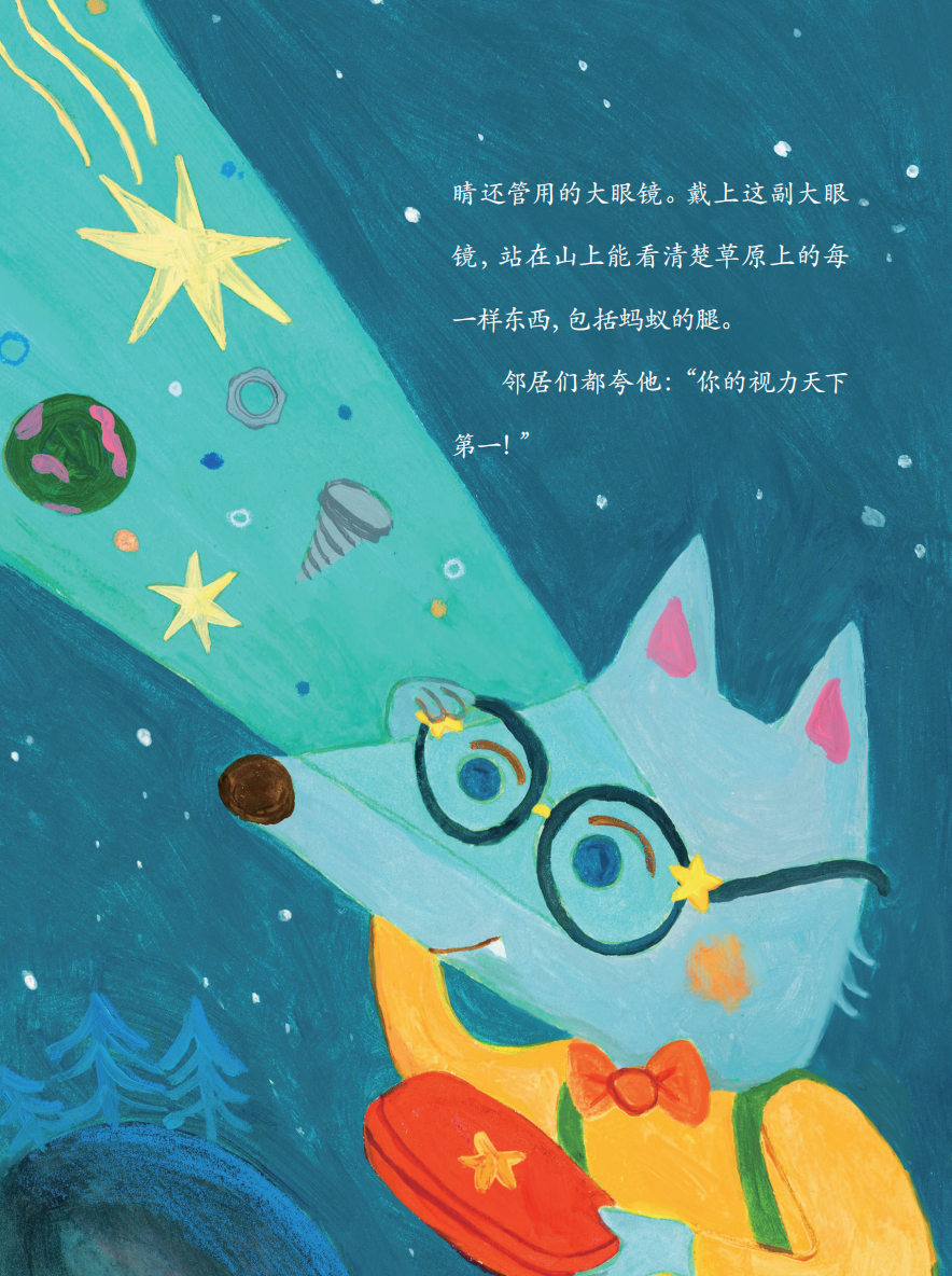 大眼狼有一双特别好使的大眼睛。比方说,他站在A山上,能看清楚B山上的麻雀羽毛上的花纹。但他听说有别的动物比他的视力好时,大眼狼心想:不行不行,我的视力必须无人能及!于是他开始不停地换眼镜,也开始看到很多不可思议的东西……
