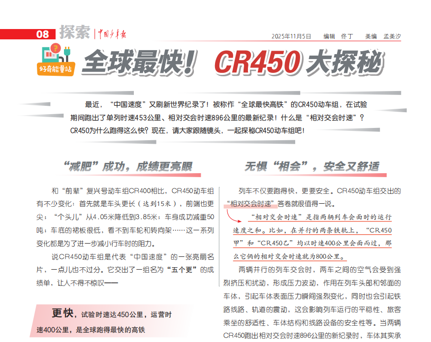 最近,“中国速度”又刷新世界纪录了!被称作“全球最快高铁”的CR450动车组,在试验期间跑出了单列时速453公里、相对交会时速896公里的最新纪录!什么是“相对交会时速”?CR450为什么跑得这么快?现在,请大家跟随镜头,一起探秘CR450动车组吧!