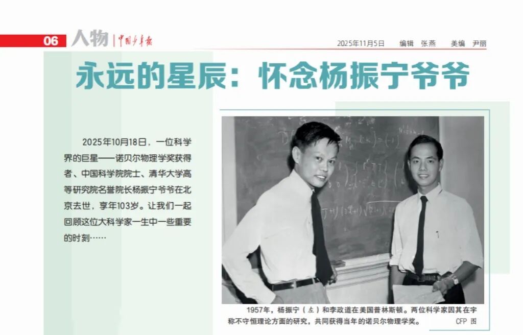 2025年10月18日,一位科学界的巨星——诺贝尔物理学奖获得者、中国科学院院士、清华大学高等研究院名誉院长杨振宁爷爷在北京去世,享年103岁。让我们一起回顾这位大科学家一生中一些重要的时刻……