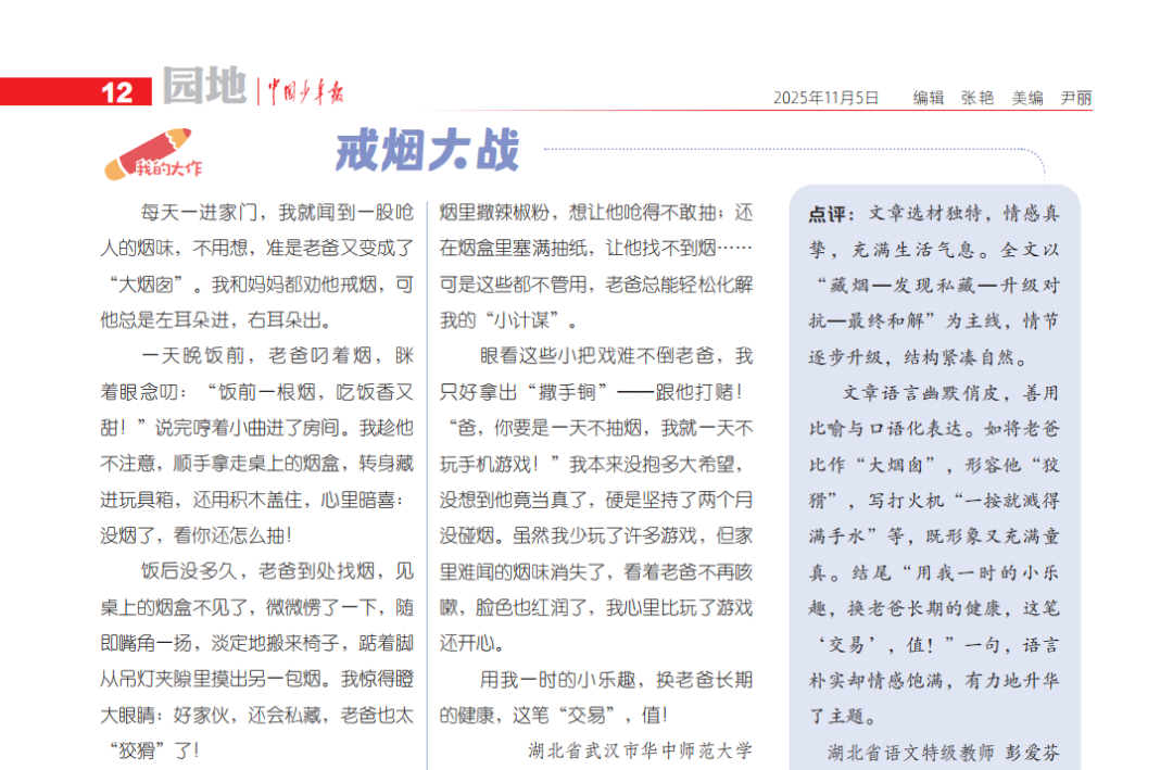 每天一进家门,我就闻到一股呛人的烟味,不用想,准是老爸又变成了“大烟囱”。我和妈妈都劝他戒烟,可他总是左耳朵进,右耳朵出。文章选材独特,情感真挚,更有湖北省语文特级教师的精彩点评,快来看看吧!
