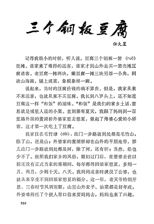 说起来,当时的豆腐价钱的确不算贵。但是,我家从来不来远客,也就从来不买豆腐。我长到八岁头上,还不知道豆腐这一样“和饭”的滋味。“和饭”是我们的家乡土话,意思就是城里人说的小菜。直到那年夏天,我跟了妈妈到一百里路外面的蜜湖挢外婆家里去憩夏,做起了外婆心爱的小娇客,这才第一次吃上了豆腐。