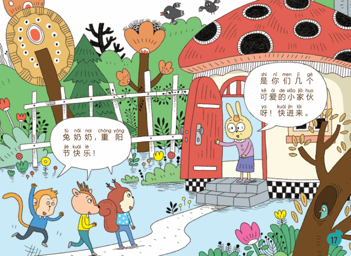 森林小学的小松鼠、小鹿和小猴,在重阳节这天带着菊花糕去陪独居的兔奶奶过节。兔奶奶“恐高”怕“三高”,同学们知道是哪“三高”吗?别忘了提醒长辈,要健康饮食防“三高”呀!