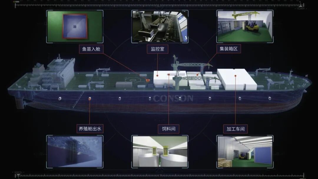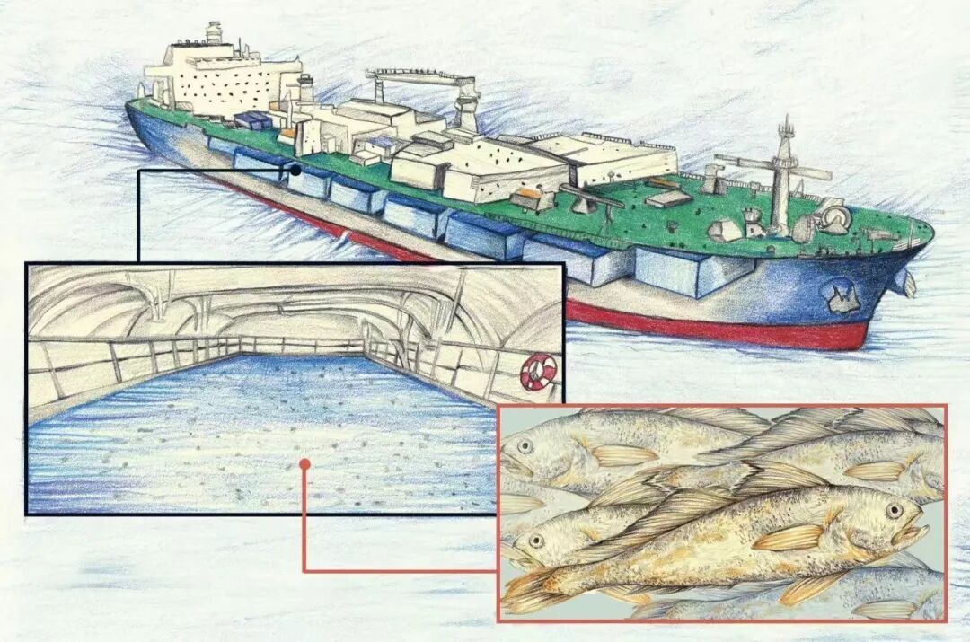那么,什么是“船载舱养”模式呢?简单来说,就是从鱼苗入舱、投喂养殖到起捕、加工、运输,鱼生长的全周期都在船上,相当于在一艘船上构建起一座渔业养殖加工厂。可以说,船开到哪里,哪里就是渔场。