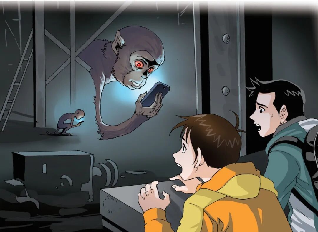 强子突然看到什么,快步追上安仔,一把将他拉到一堆杂物后面,两人小心地探出头,只见前方不远处,有个黑影从空中跳下,捡起了那部手机。手机屏幕发出的光芒映到一张不似人类的面孔,这下,安仔和强子终于看清了怪影的真面目——竟是一只毛茸茸的猴子!