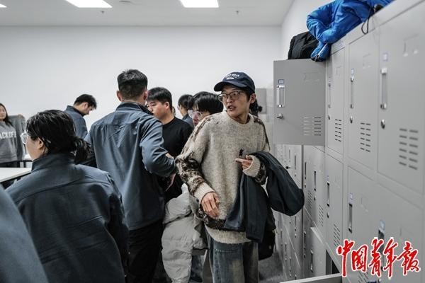 11月7日,北京人形机器人数据训练中心,下班后,25岁的王鑫(右一)和同事们换下工服准备回家。