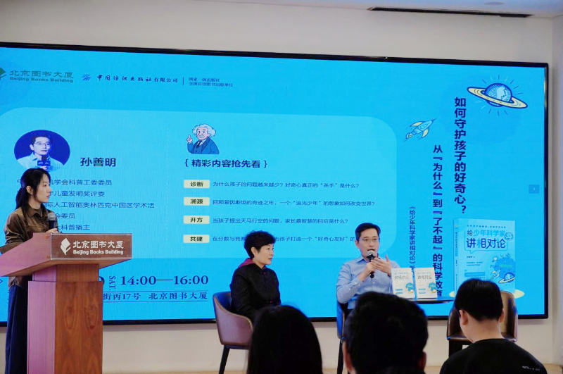 11月9日,由中国纺织出版社主办的《给少年科学家讲相对论》新书分享会在北京图书大厦一层共享空间举行。本次活动特别邀请到《给少年科学家讲相对论》作者、中国计算机学会科普工作委员会委员孙善明,与《青春期突围:成长型父母的进阶课》作者、高级教师周瑾展开对谈。现场汇聚众多亲子家庭,会议围绕“青少年好奇心培养”和“AI时代学习方式”等核心议题,展开了一场兼具深度与温度的交流。