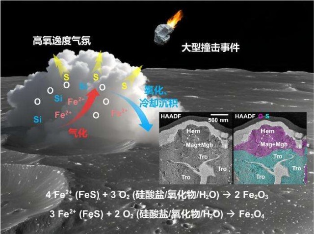 科研团队提出,赤铁矿的形成可能与月球历史上的大型撞击事件密切相关。大型撞击形成瞬时高氧逸度气相环境的同时,铁元素在高氧逸度环境中被氧化,使陨硫铁发生了脱硫反应,经气相沉积过程形成微米级晶质赤铁矿颗粒。
