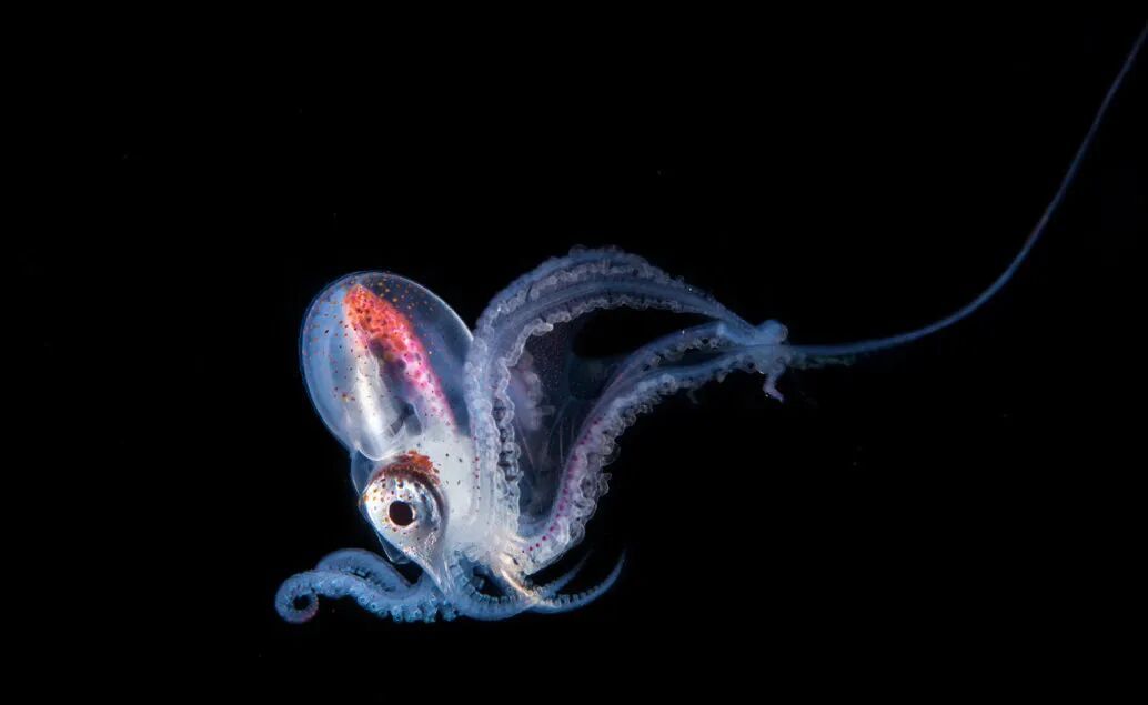 毯子章鱼是一类浮游生活的动物,主要分布在热带和亚热带的表层到中层海域。目前,人类对它们的生活细节还知之甚少。