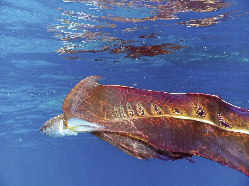 如果遇到有经验的捕食者,“瞬间变形”的招术就失去作用了。不过,雌性毯子章鱼还会使出另一保命绝招——断腕求生术,将腕足或腕间膜断掉,留给捕食者,以转移捕食者的注意力,趁机逃之夭夭。对于雌性毯子章鱼来说,损失一段腕足或薄膜总比丢掉性命要好。况且,它的腕足和薄膜不久之后还会长出来。
