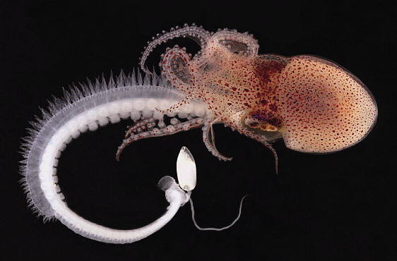 瞧,这就是我在网上找到的成年雄性毯子章鱼的照片。哦,对不起,放错了,这是大王乌贼的照片,这一张才是雄性毯子章鱼的照片。它不仅个头儿小得可怜,还没有腕间薄膜,而且它的眼睛特别大,看起来就像一只萌萌的章鱼幼崽儿。