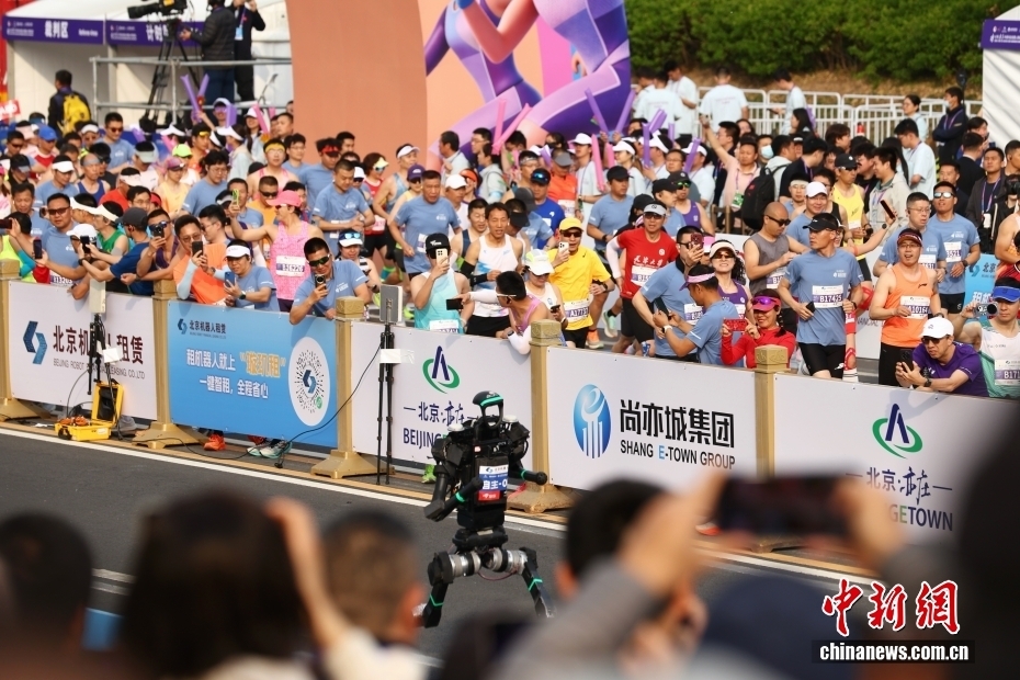 4月19日,2026北京亦庄半程马拉松暨人形机器人半程马拉松在北京亦庄举行。百余台人形机器人逐次出发,与人类选手同场竞技,共同挑战半马赛道。图为破风闪电队遥控人形机器人选手闪电在比赛中。