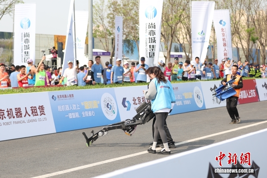 4月19日,2026北京亦庄半程马拉松暨人形机器人半程马拉松在北京亦庄举行。图为工作人员救助冲线后摔倒的机器人。