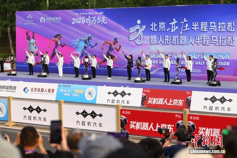 4月19日,2026北京亦庄半程马拉松暨人形机器人半程马拉松在北京亦庄举行。图为王亚平(右五)等为比赛鸣枪发令。