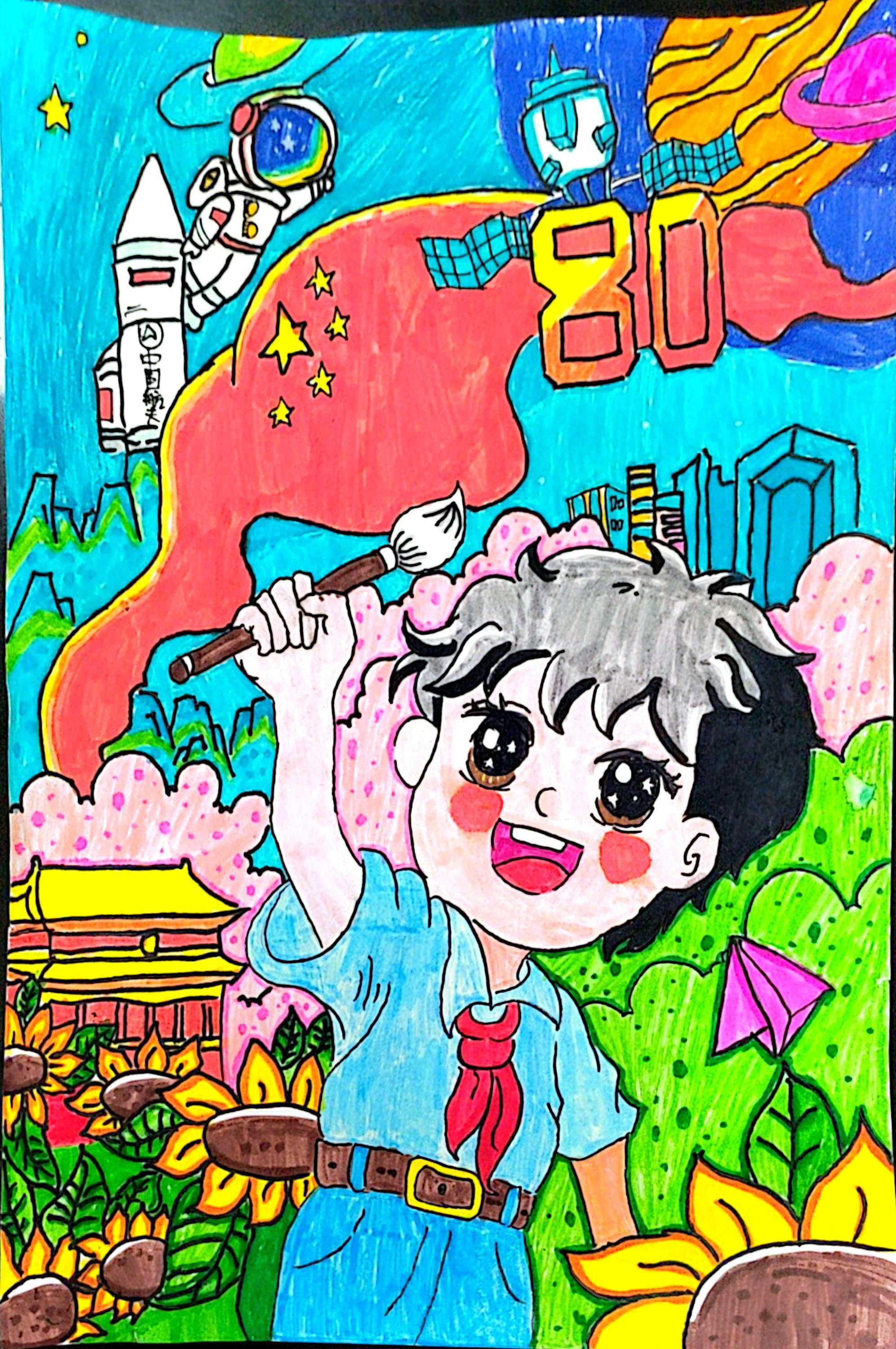 我是江苏省海安市明道小学的曹博涵,我用画笔描绘祖国的大好河山,我们的生活五彩斑斓,愿中国的明天更加灿烂!加油,中国!