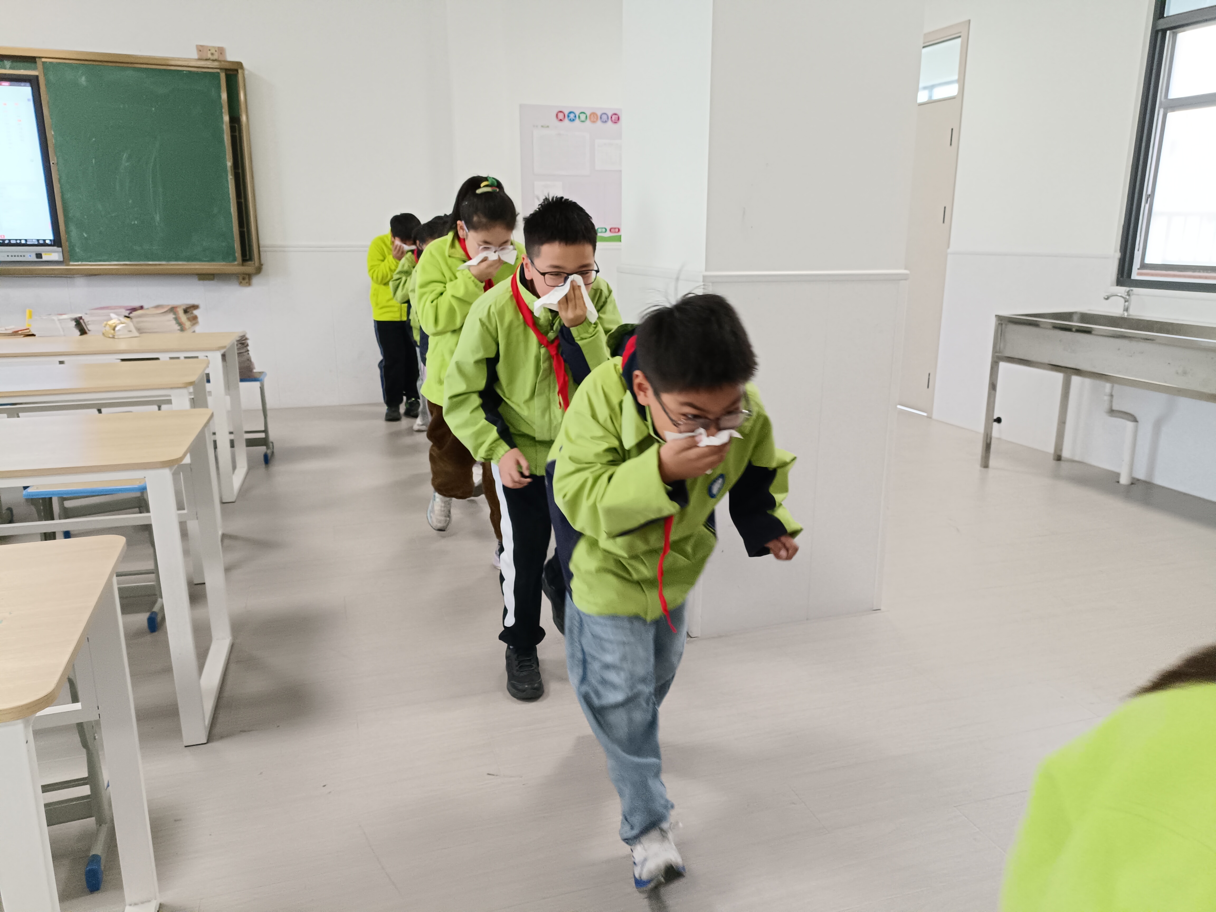 随着消防警报的响起,少先队员们在老师的带领下,用湿纸巾捂住自己的口鼻,弯腰低姿沿着疏散线路快速行进,不到2分26秒,孩子们顺利撤离到安全区域,展现了孩子们良好的应急疏散能力。