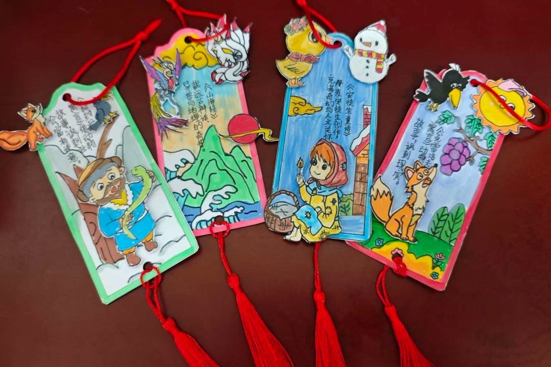 三年级学生巧用卡纸、彩绳、干花等材料,将奇思妙想与读书热忱凝于方寸书签。或绘书中经典人物,惟妙惟肖;或书励志读书格言,字迹工整;或做立体创意造型,趣味十足。这些小巧的书签不仅是阅读标记,更承载着孩子们对知识的渴望与对美的追求。