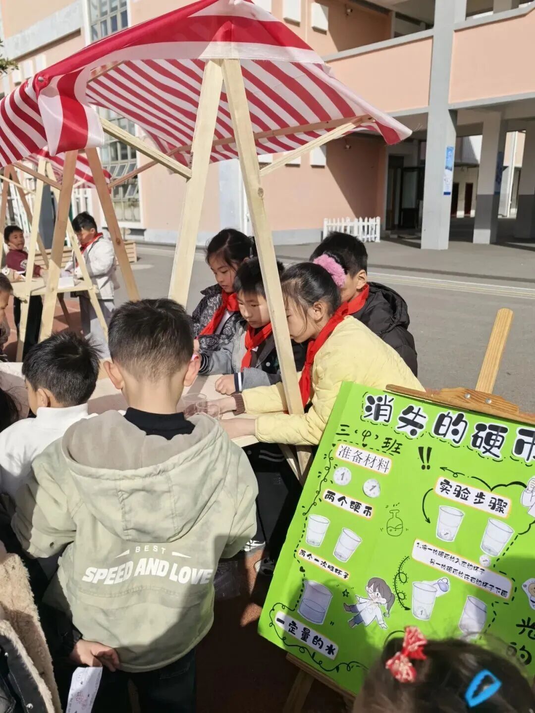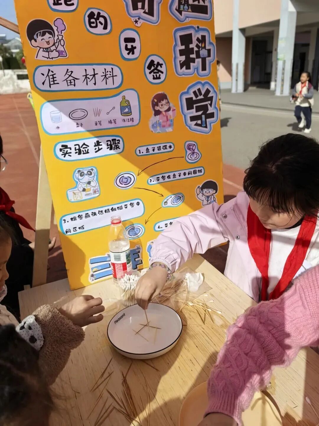 科技游园会时段,各年级分批次沉浸于充满趣味的科学乐园。三四年级搭建的实验摊位前挤满了前来挑战的小小“探索者”:有同学在“逃跑的牙签”实验摊位前屏息凝神,看着沾了洗洁精的牙签在水面迅速游动;有同学围观的“会跳舞的豆子”在醋与苏打的融合中上下翻飞,演绎着酸碱反应的活泼姿态;有同学则以“泼水成画”探索流体动力学与色彩的交融,在水墨晕染间感受科学之美……各个摊位前排起长龙,孩子们在亲手操作中体验科学原理,每一次成功的实验都引来阵阵欢呼。