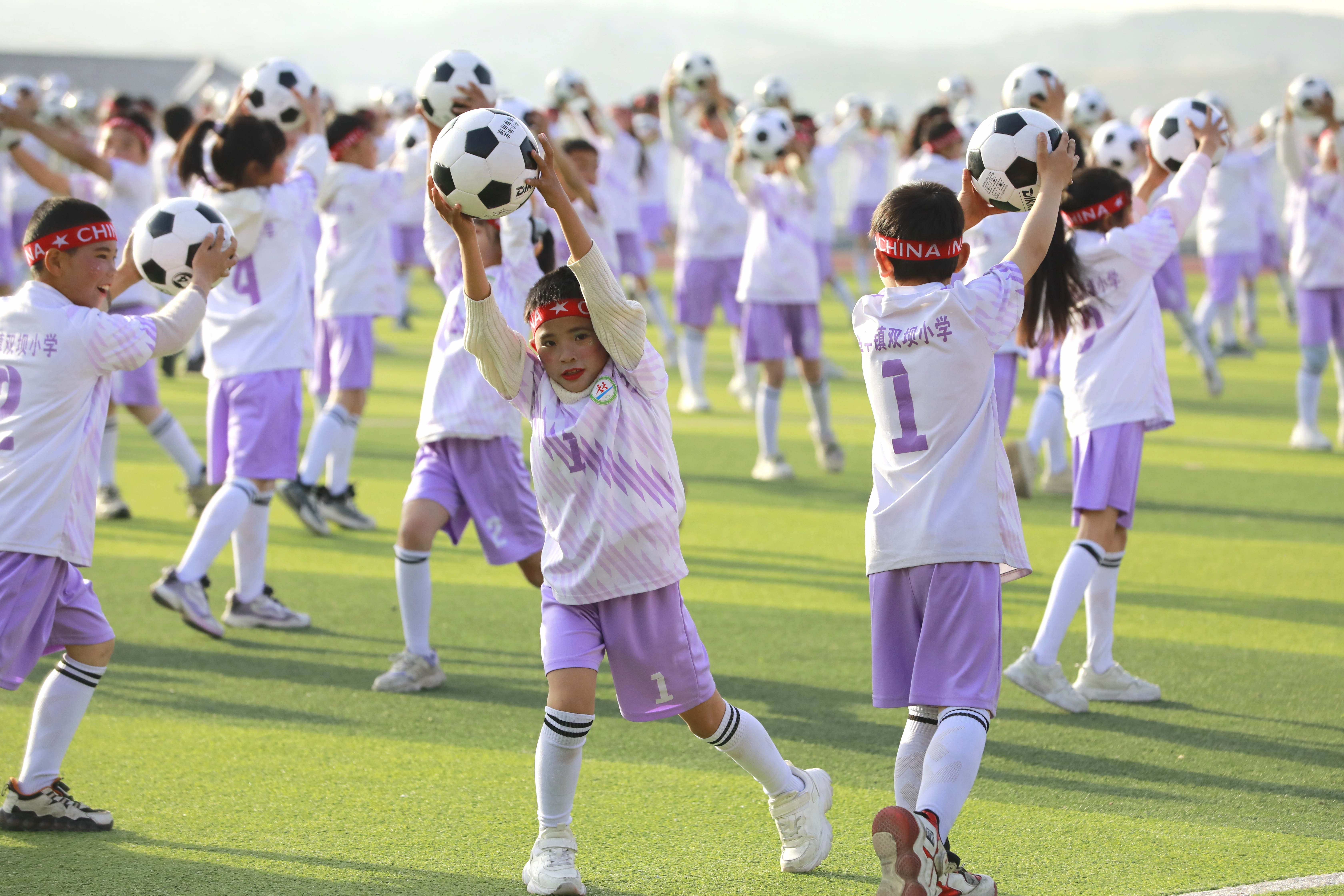 双坝小学的足球操《少年中国》表演点燃全场。210名学子身着统一服装,在绿茵场上奔跑跳跃,足球在他们脚下灵动生风。转身、传球、颠球,每个动作都洋溢着少年的蓬勃朝气。这所被誉为“足球特色学校”的乡村小学,已将足球运动深度融入课后服务课程体系,形成了鲜明的品牌特色。“我们不仅在体育课和大课间练习,课后服务时间还有专业老师指导足球技能。”一名满脸汗水的小学生边熟练地颠球边说,“现在作业少了,活动多了,全班同学都爱上了运动。”评委组认真记录着每个环节的表现,从团队配合到个人技术,从精神面貌到艺术表现,都成为打分的重要依据。