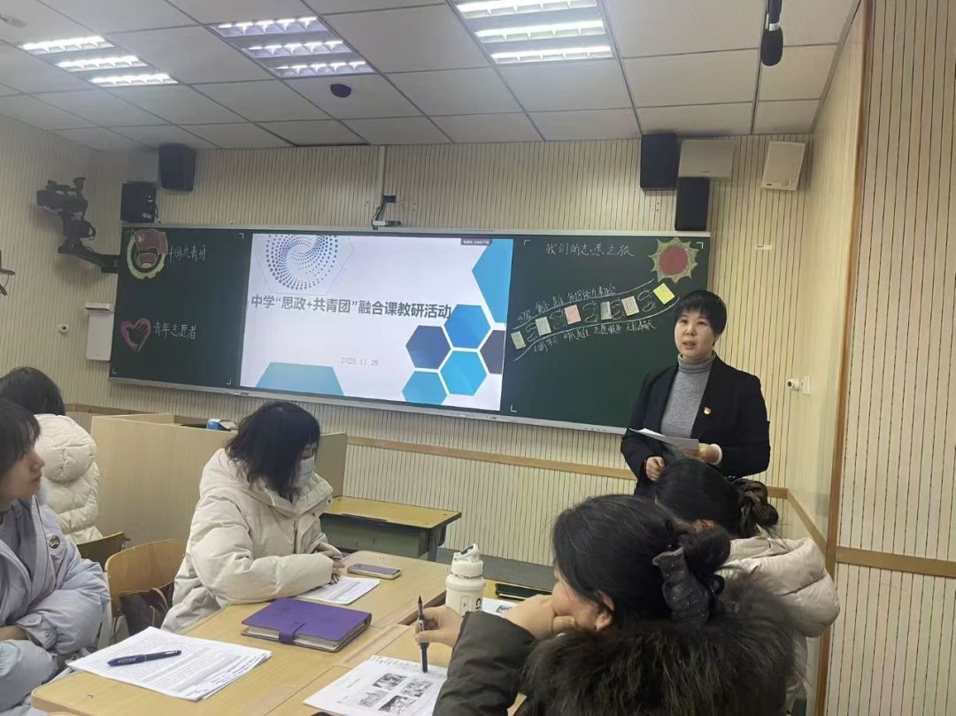 活动现场,中国青少年研究中心青年组织所副所长郑浩博士,第五分支书记、思政学部顾问徐静,小学思政研修员、思政学部部长聂满欣,团队课研修员王海燕,七、九年级道德与法治研修员、学科组长李红梅,八年级研修员冯娜等专家领导全程参与。课程展示阶段,参会人员集中观摩课堂教学,感受赵雪老师与石志超书记引领下,志愿精神与青春力量的生动碰撞;研讨交流阶段,大家围绕课程设计、双师协同、融合创新等话题展开深入研讨,为进一步优化“思政+共青团”一体化教学建言献策。