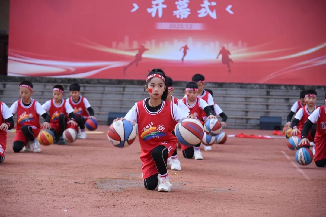 五年级学生表演整齐有力的篮球操;