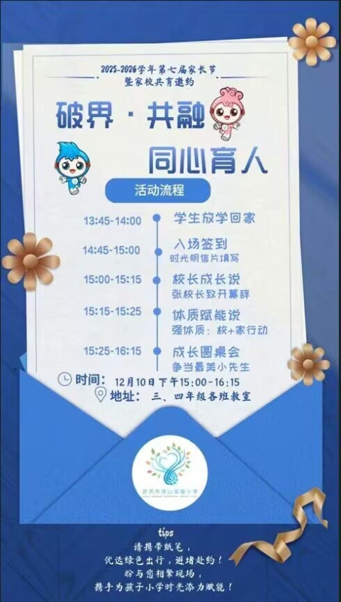 2025年12月10日,武汉市洪山实验小学十岁礼暨第九届家长节活动温情启幕。本次活动以“感恩成长,筑梦未来”为核心主题,既是家校共育的深度联结,更是为孩子们的“幼学之年”镌刻成长印记的特别仪式。作为活动的顶层设计者与执行者,我们围绕环境打造、校园文化再设计、十岁礼主题体验三大核心亮点,让这场成长礼成为孩子、家长与学校共同的温暖记忆。