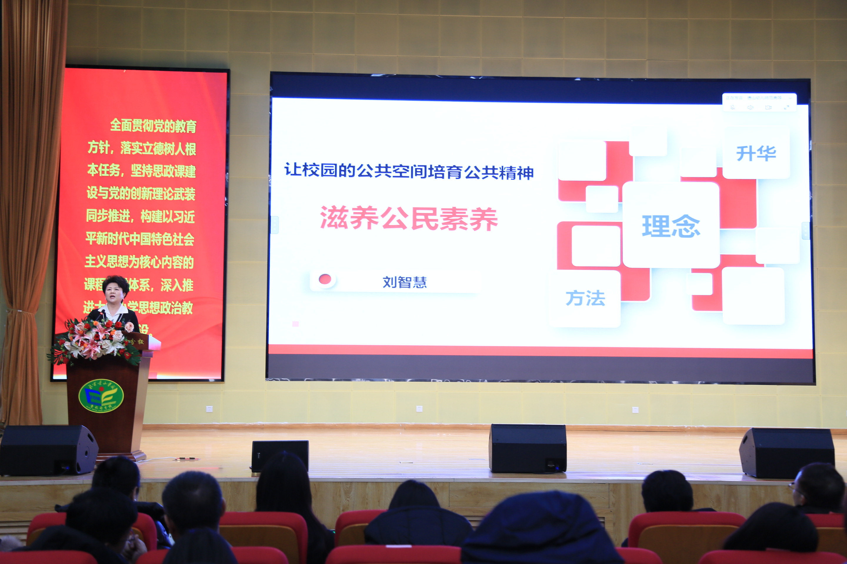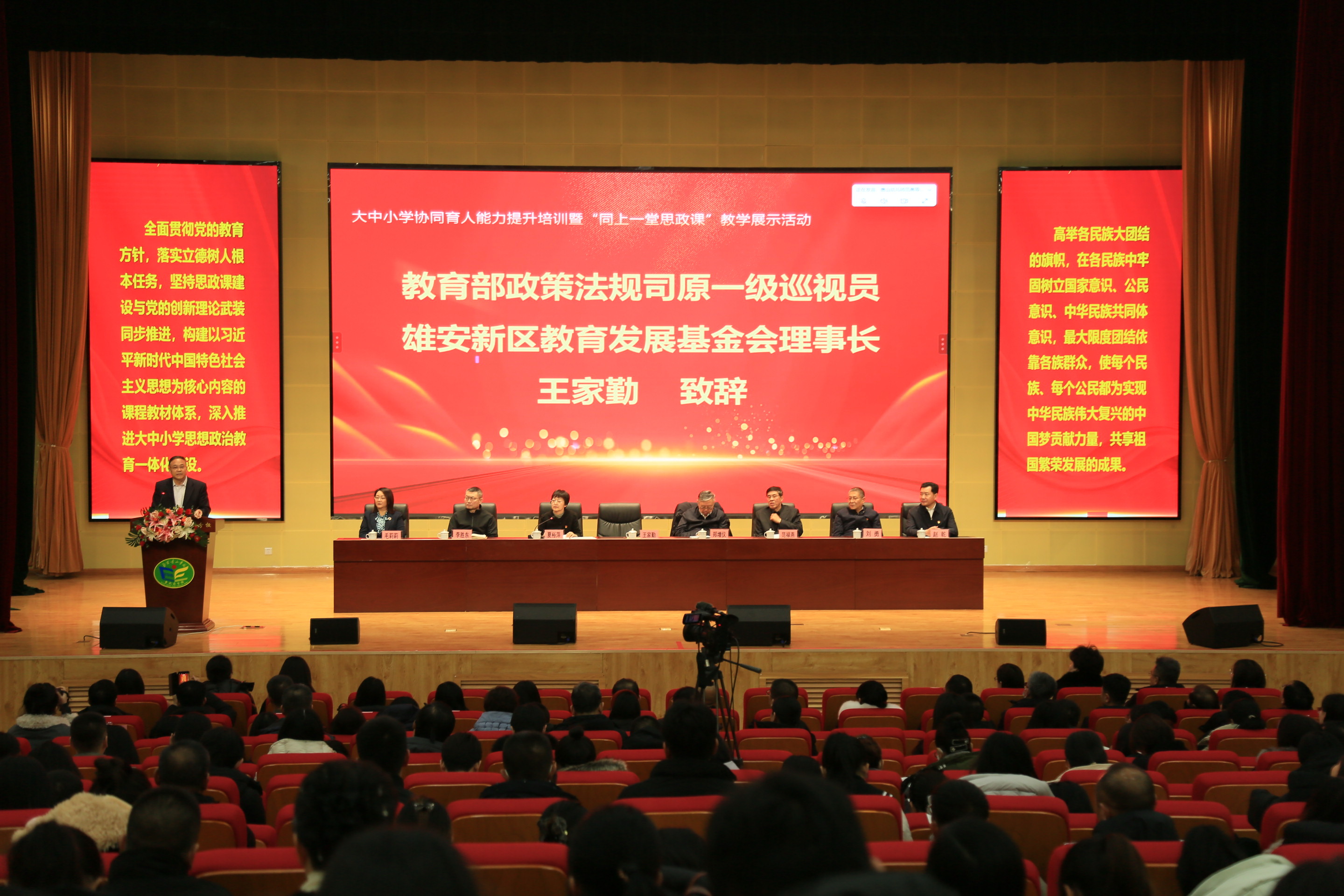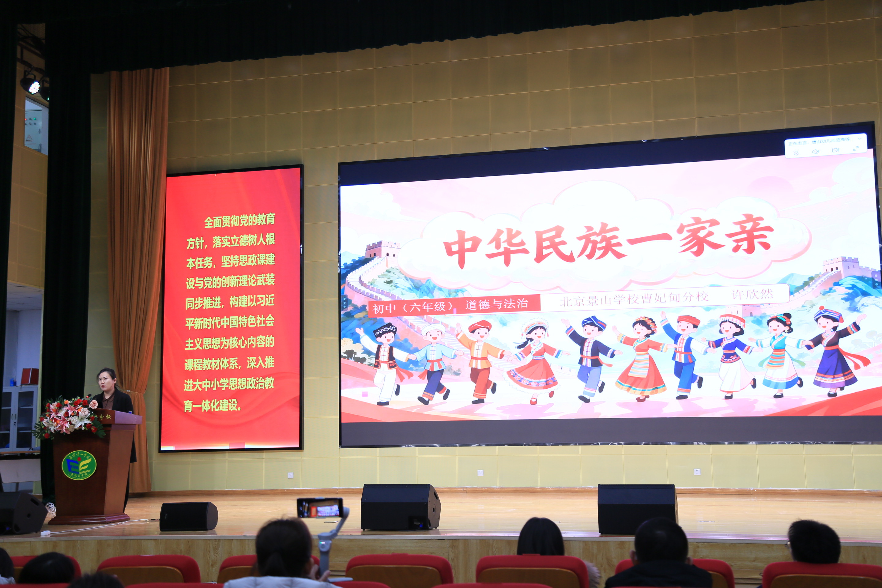 当渤海之滨的红色基因遇上雪域高原的团结之歌,一堂思政课能碰撞出怎样的思想火花、绽放出何等的时代光芒?一场跨越千里的思政盛会正在唐山书写着“中华民族一家亲”的生动答卷。2026年1月9日,大中小学协同育人能力提升培训暨“同上一堂思政课”教学展示活动在北京景山学校曹妃甸分校正式拉开帷幕。本次活动由中共唐山市委教育工委、市委宣传部、市民族宗教事务局主办,曹妃甸区人民政府、唐山幼儿师范高等专科学校、北京景山学校曹妃甸分校共同承办,唐山幼儿师范高等专科学校党委书记夏裕萍主持会议。教育部基础教育司原副司长、国家督学郑增仪,教育部政策法规司原一级巡视员、雄安新区教育发展基金会理事长王家勤,北京景山学校原校长、北京景山学校教育集团理事长、北京景山学校曹妃甸分校校长范禄燕等领导莅临现场并致辞。来自广西、西藏、内蒙古、新疆、宁夏等五省(区)及京津冀地区的教育工作者齐聚一堂,以“中华民族一家亲”为核心主题,通过“线上+线下”同步展示的形式,用协同育人的实践探索,诠释着民族团结教育的深层密码。