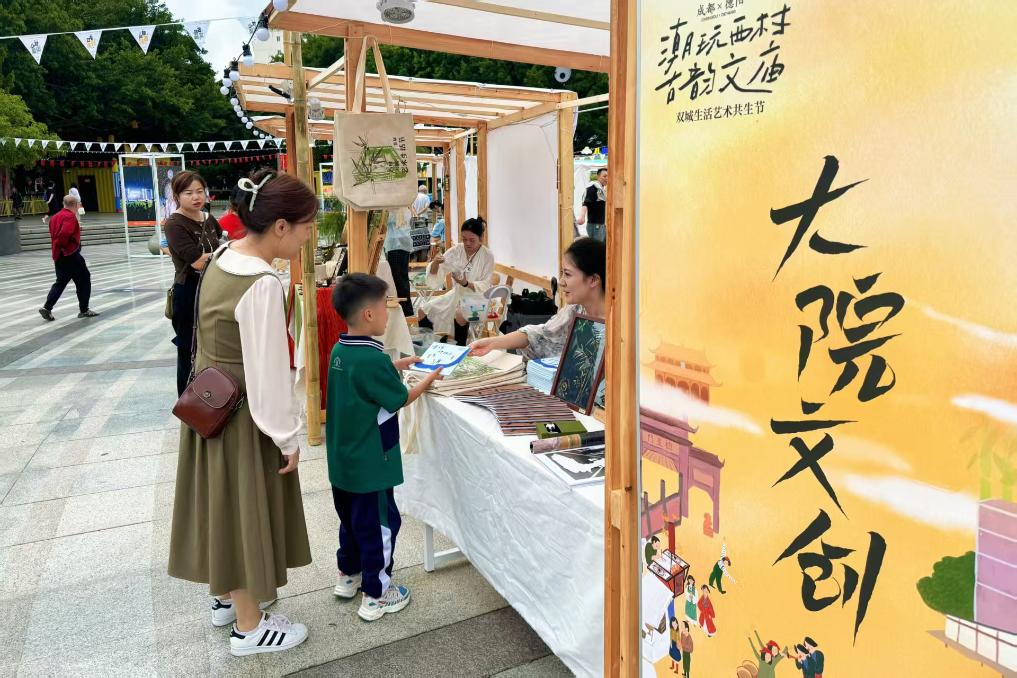 在成都西村大院,“潮玩西村·古韵文庙”双城文化节吸引不少市民及游客关注。走进西村大院非遗文创市集,仿佛进入非遗展品长廊,中江挂面的柔韧细腻、绵竹年画的绚丽色彩……30个四川德阳非遗展位在竹林掩映下,将传统技艺融入现代生活场景。