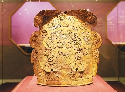 辽代双凤戏珠纹卷云冠由16片形状如云朵的镂空金属片连缀拼合而成,上面还有22枚鎏金圆片,饰有菊花、鹦鹉、雁、飞鸟、太极图案,其纹饰具有典型的中原文化元素。