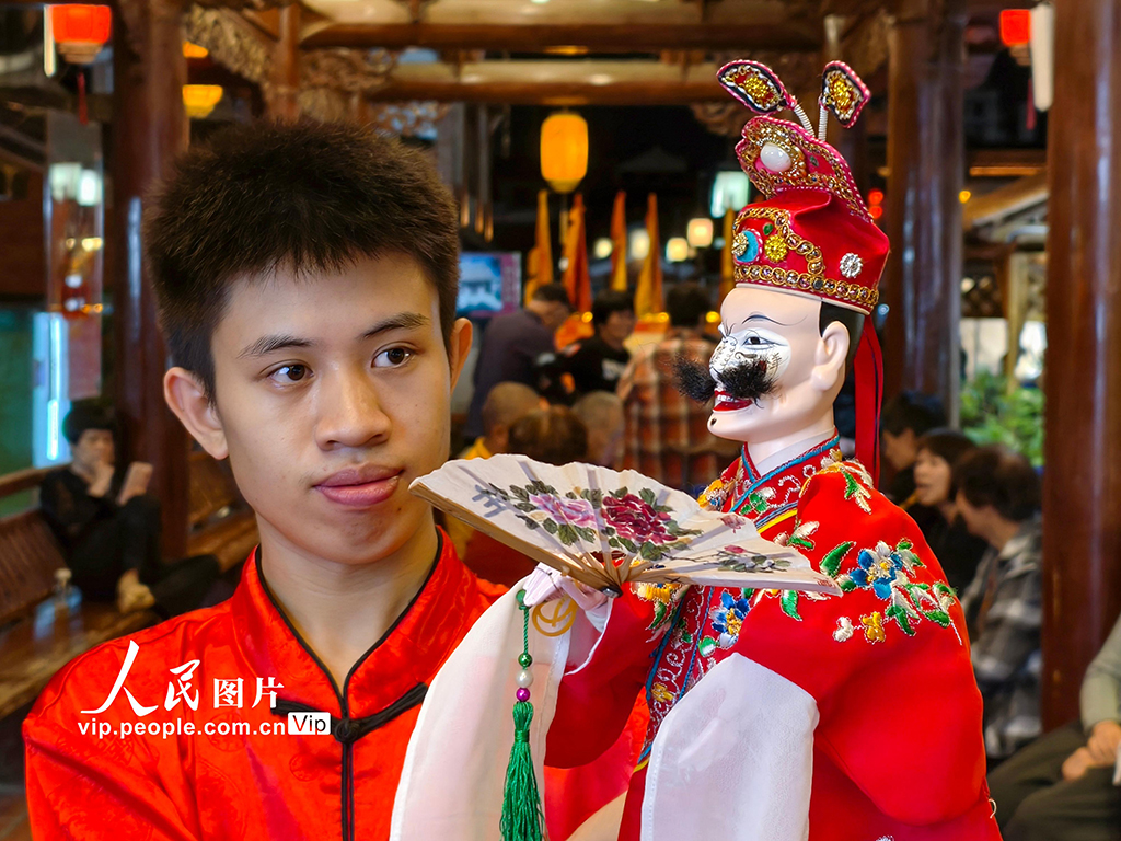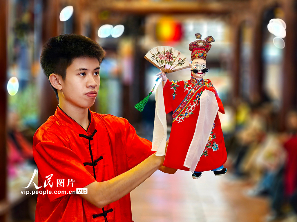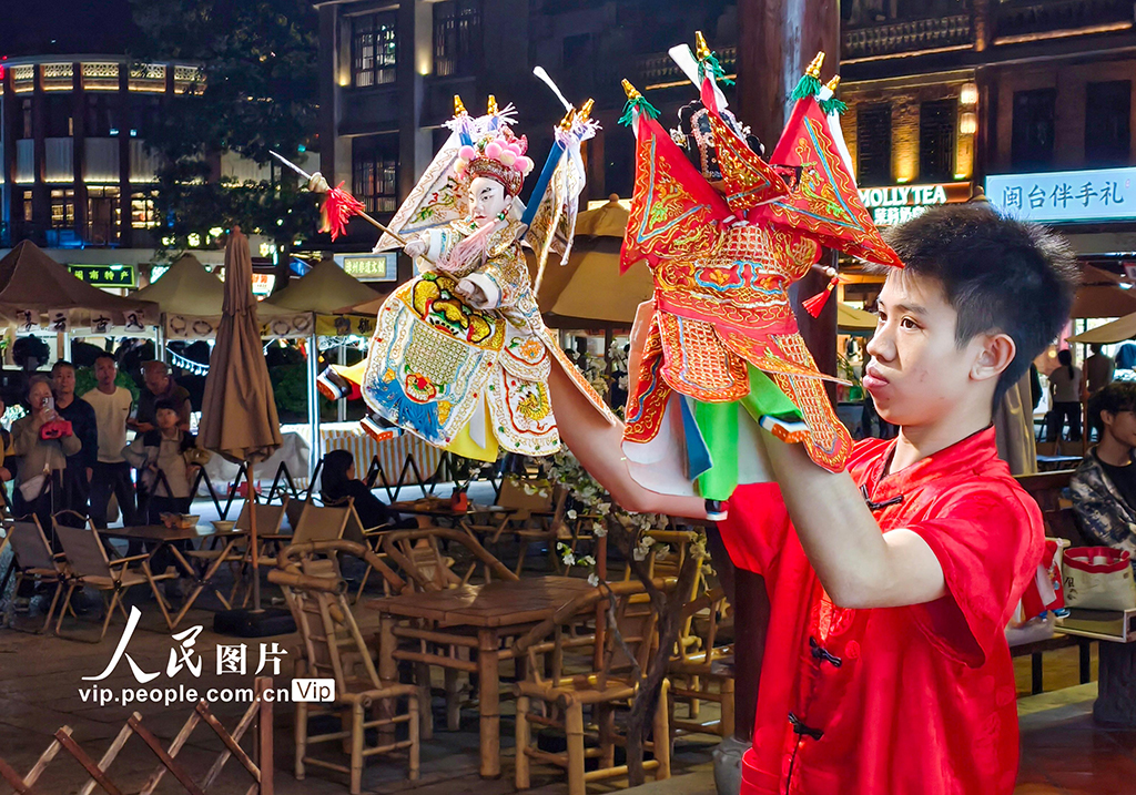 2025年11月13日夜,福建漳州古城内,一位年轻艺人在长廊的方寸戏台上指掌翻飞,活灵活现地表演布袋木偶戏,引得游客纷纷驻足喝彩。 近年来,漳州市将特有的布袋木偶艺术作为古城夜经济的亮点,组织街头表演,既留住了游客的脚步,又带动了周边餐饮、文创和民宿消费,让千年文化在烟火气中焕发新生。胡学军摄(人民图片网)