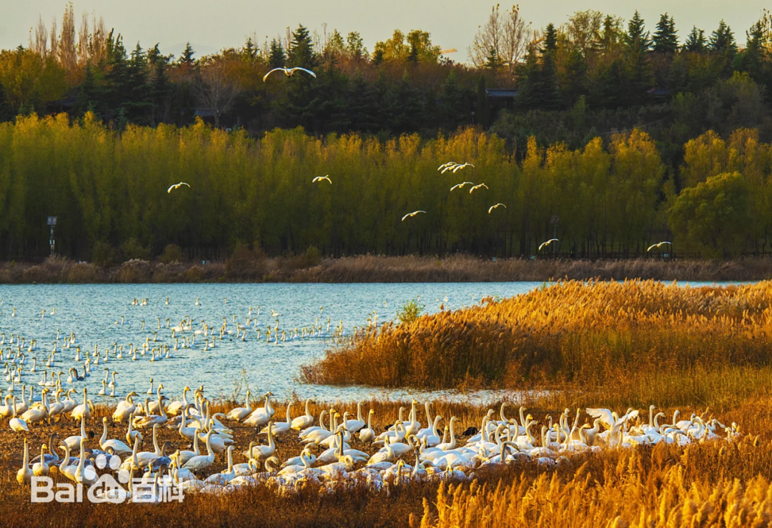 这是河南省三门峡市的天鹅湖城市湿地公园。每年10月中下旬,来自蒙古国和西伯利亚的大天鹅都会长途迁徙,途经三门峡市,便在此地的浅滩湿地栖息越冬。三门峡市也因此有了“天鹅之城”的美誉。