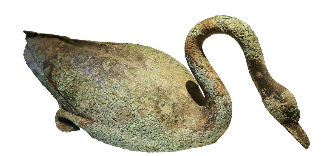 这尊青铜天鹅来自秦始皇陵被发现的第七座陪葬坑,坑中共出土青铜水禽46件,又称“水禽坑”。