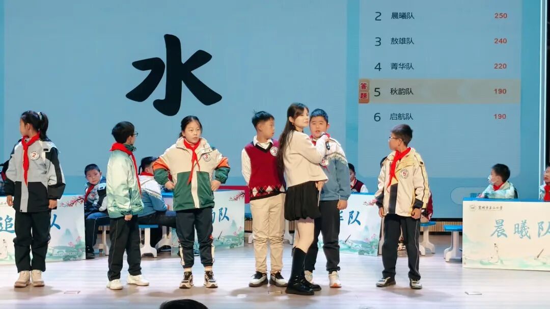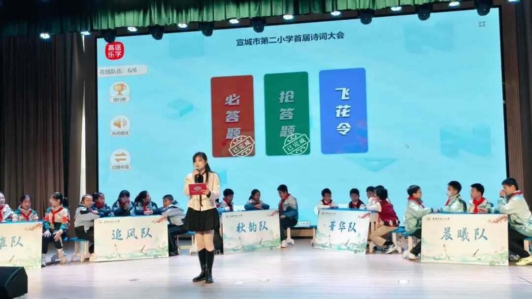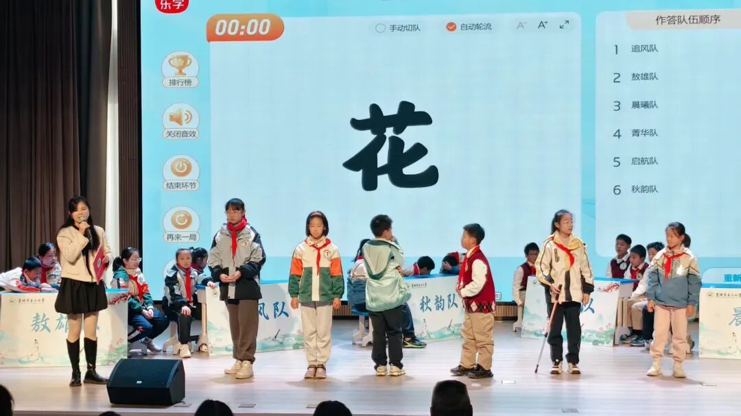 比赛分两场:五年级专场和六年级专场,每场分三个环节:必答题、抢答题、飞花令。