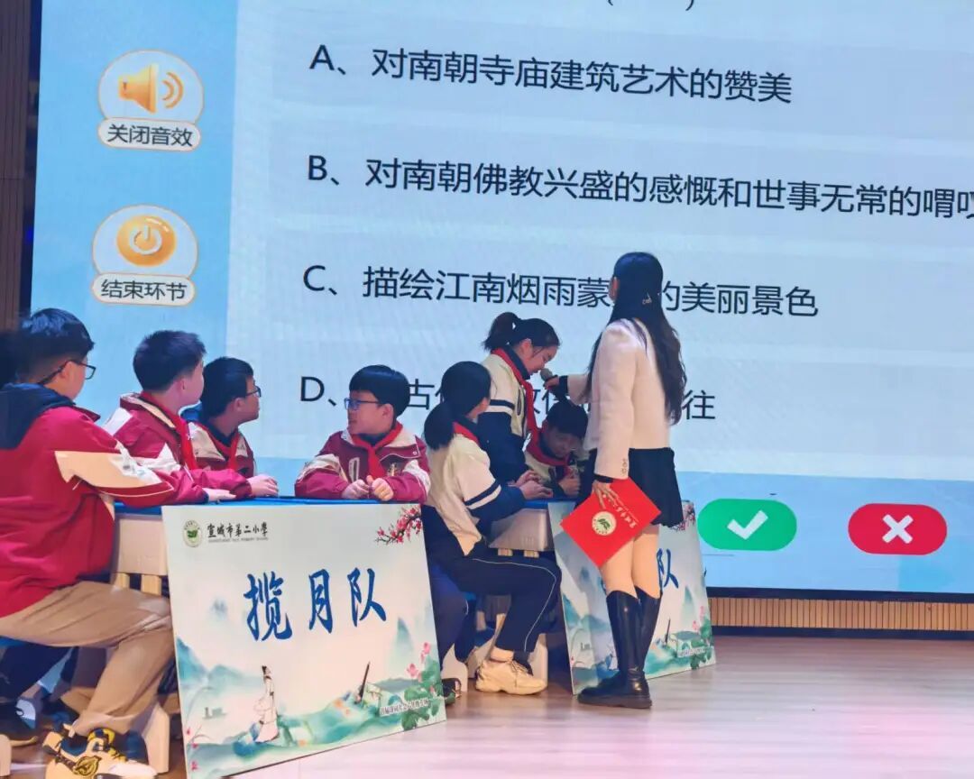 大会伊始,必答题环节率先拉开帷幕。各代表队依次作答,题目涵盖诗词背诵、作者生平、诗句释义等基础内容。如“‘忽如一夜春风来,千树万树梨花开’描写的是什么季节的景色?”“请背诵李白的《送友人》。”