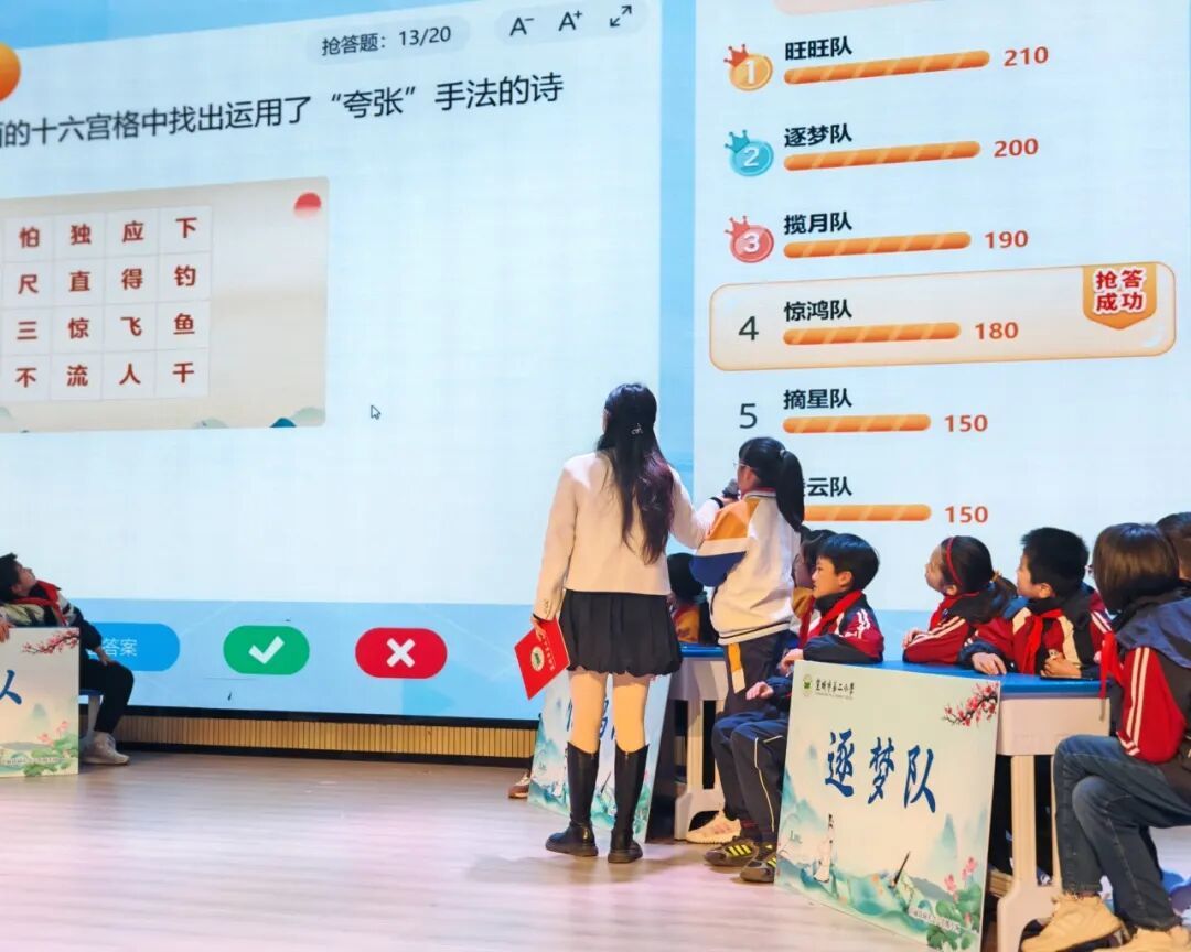 随着比赛的进行,难度逐渐加大,选手们沉着思考、灵感迸发,不断刷新答题记录。最终,经过多轮激烈角逐,五年级(2)班和六年级(2)班凭借出色的表现脱颖而出,摘得飞花令环节的桂冠。