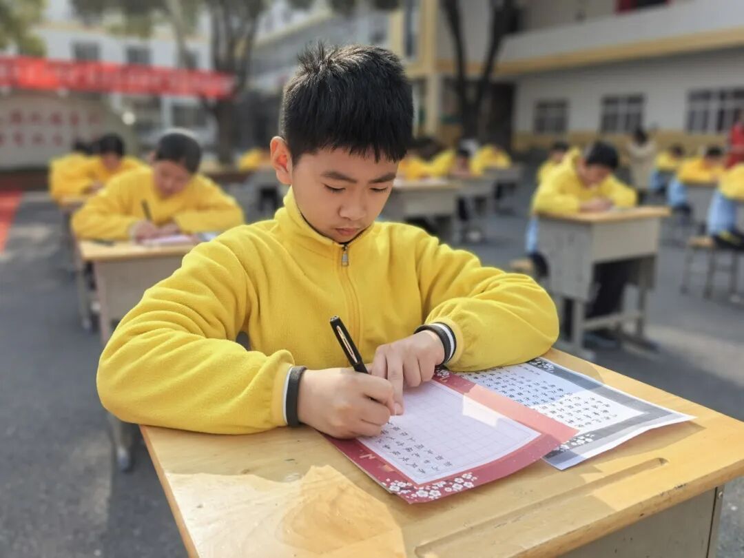 赛事现场,墨香与期待静静交融。学校特备的洒金红纸仿佛片片祥云,承载着即将诞生的吉祥祝愿。同学们屏息凝神,提腕悬肘,笔尖轻触纸面这一刻,喧嚣远去,只余笔锋行走的沙沙声,如春蚕食叶,宁静而充满力量。