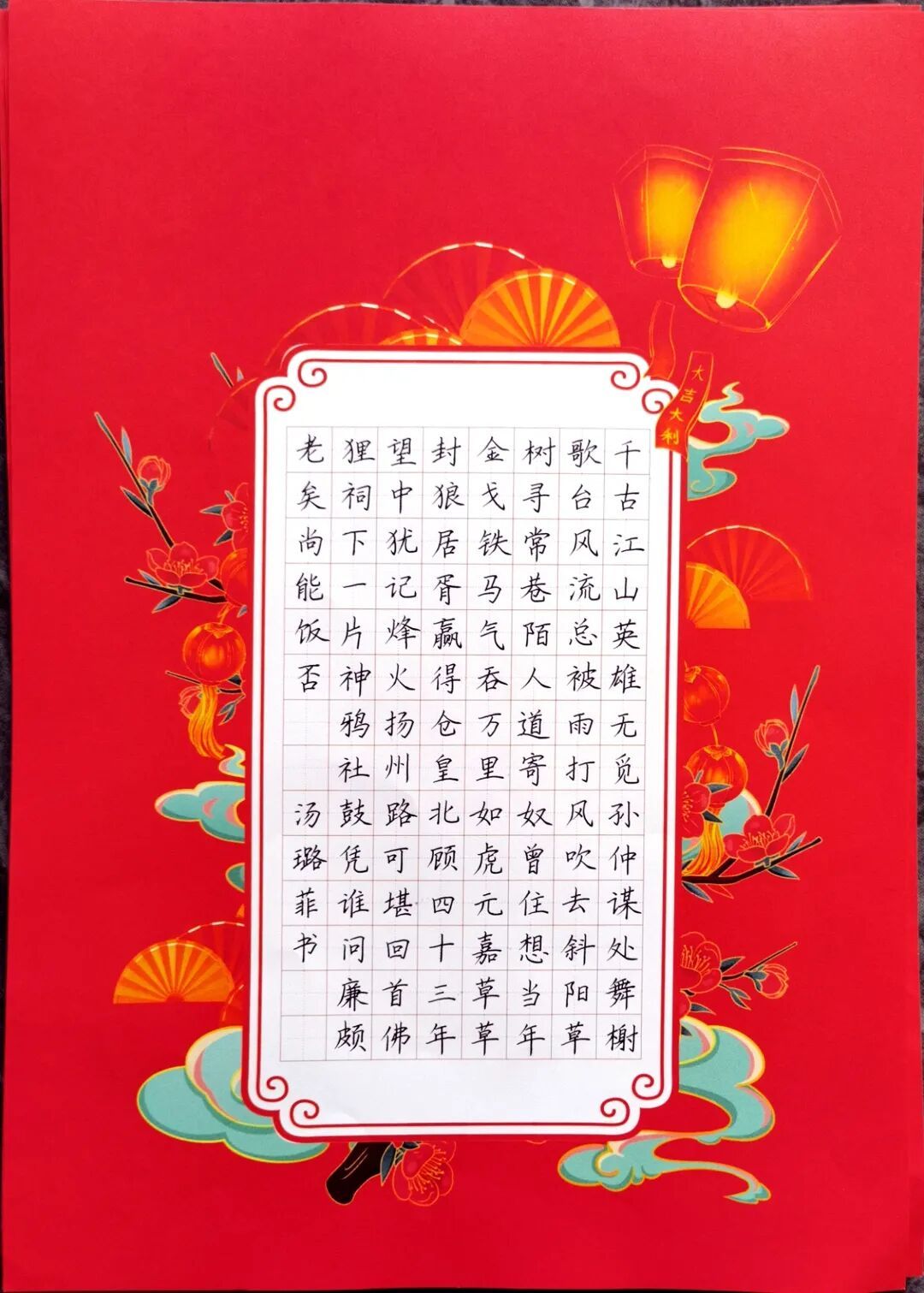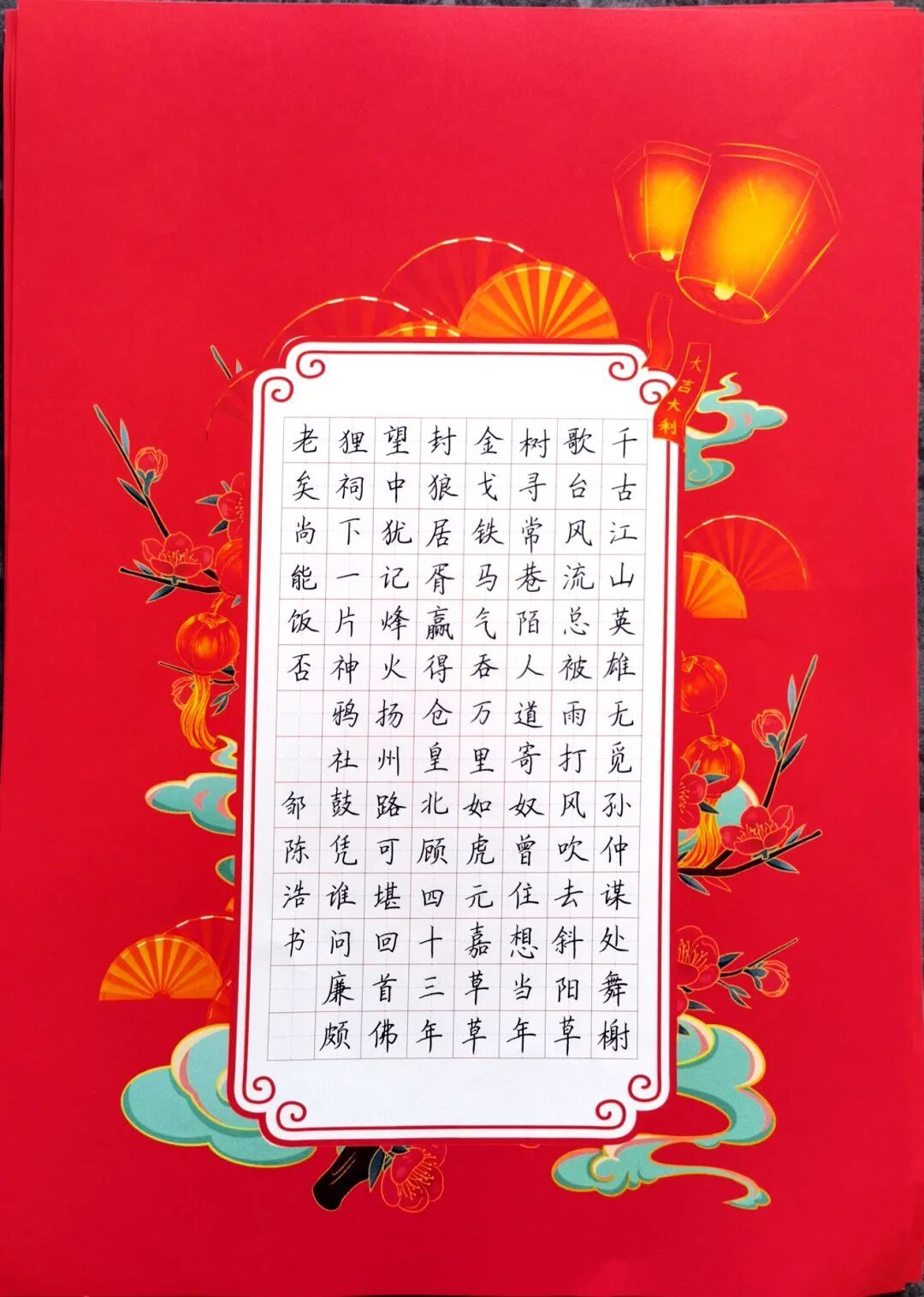 书写内容满载年味与诗情:低年级的《新春》《欢度春节》满是对新岁的朴素向往;高年级则提笔挥就《迎春歌》等古典诗篇。一横一竖,书写的是规矩方圆;一撇一捺,流露的是文化自信。