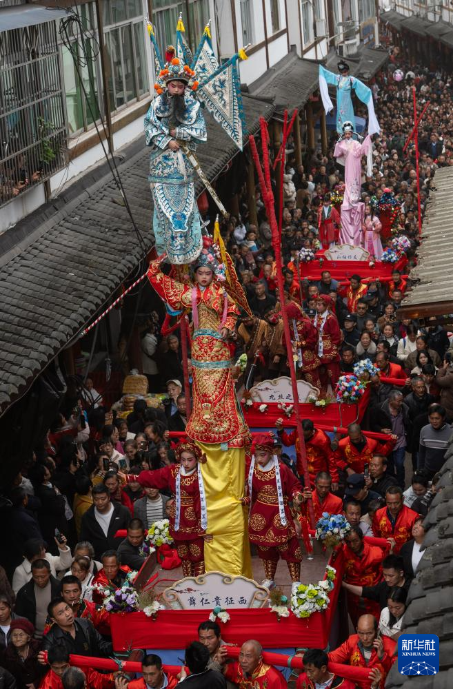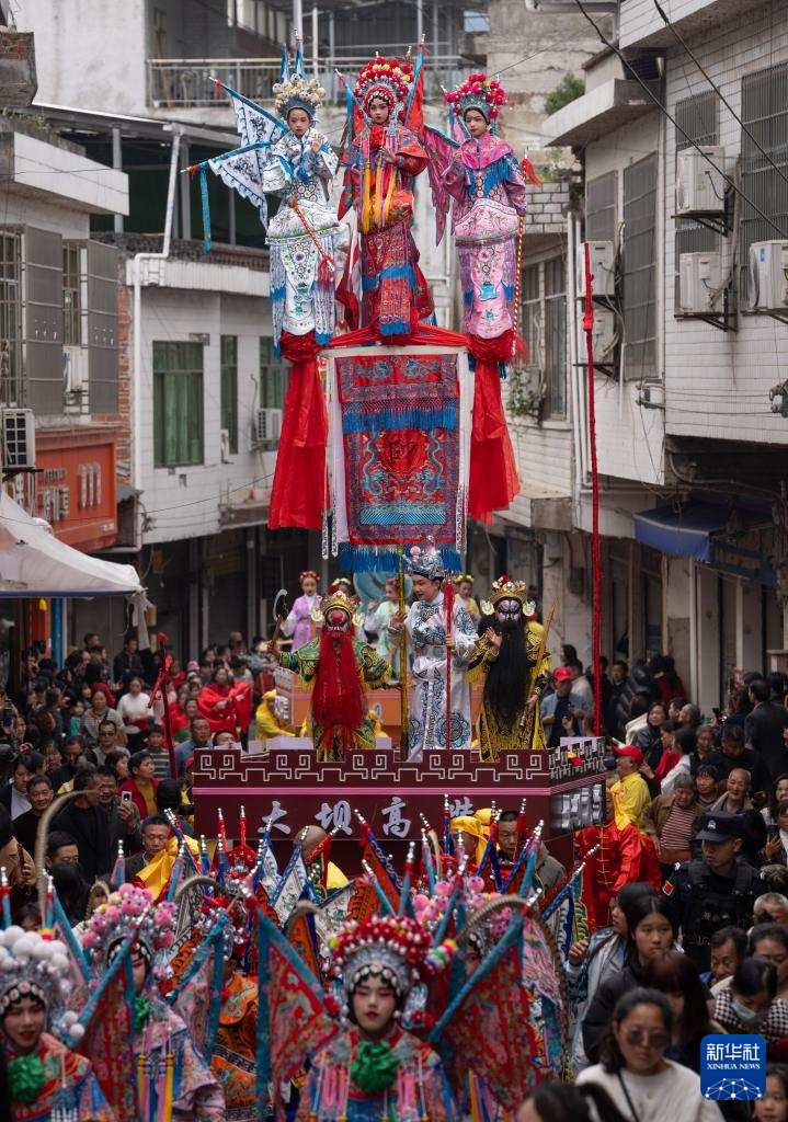 3月21日,四川省兴文县大坝苗族乡晏州社区,演员在巡游活动中表演大坝高装《西游记》。