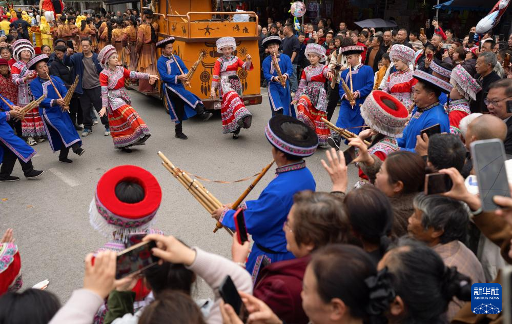 3月21日,在四川省兴文县大坝苗族乡晏州社区,大坝高装非遗巡游队伍中的苗族群众载歌载舞。
