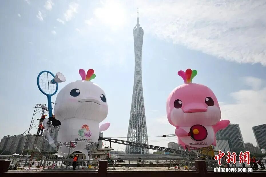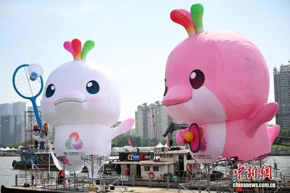 11月1日,工作人员在广州市海心沙码头珠江水面搭建大型全运会吉祥物运动造型景观装置。中新社记者 陈楚红 摄