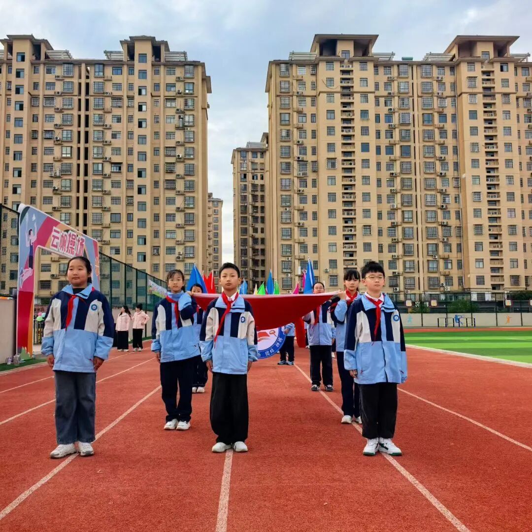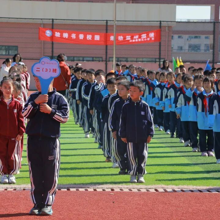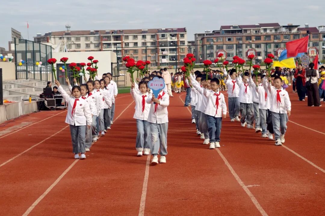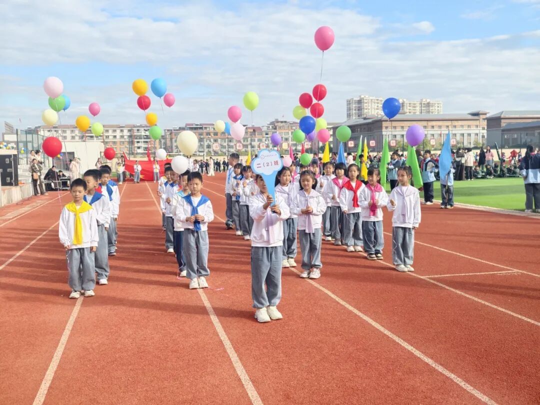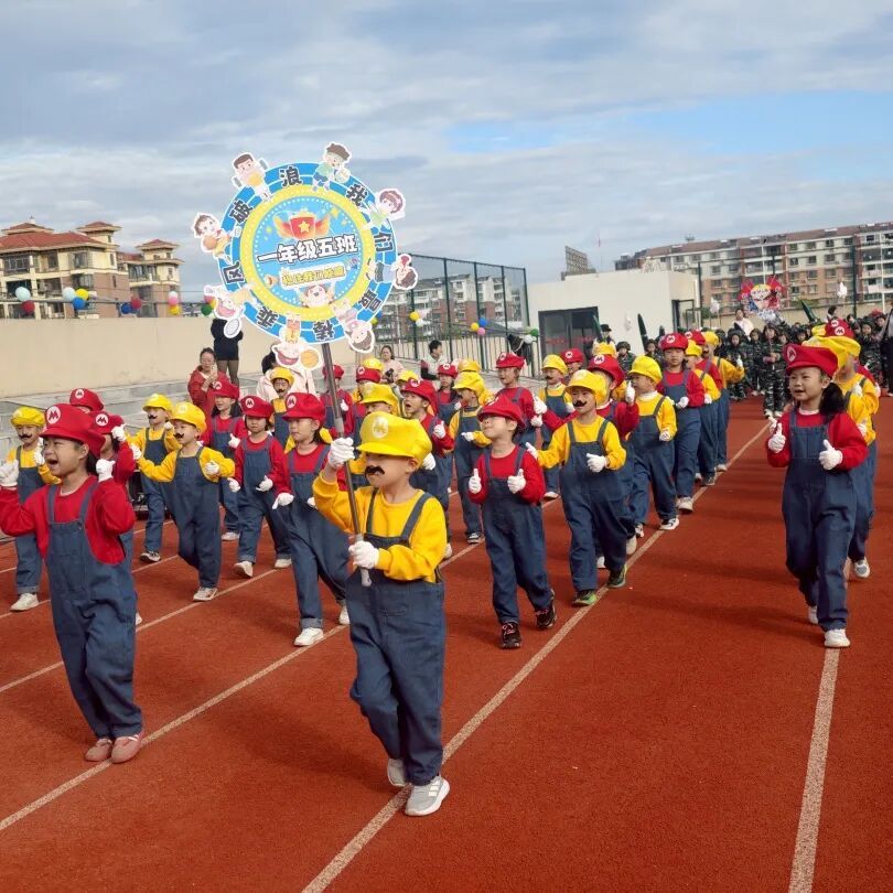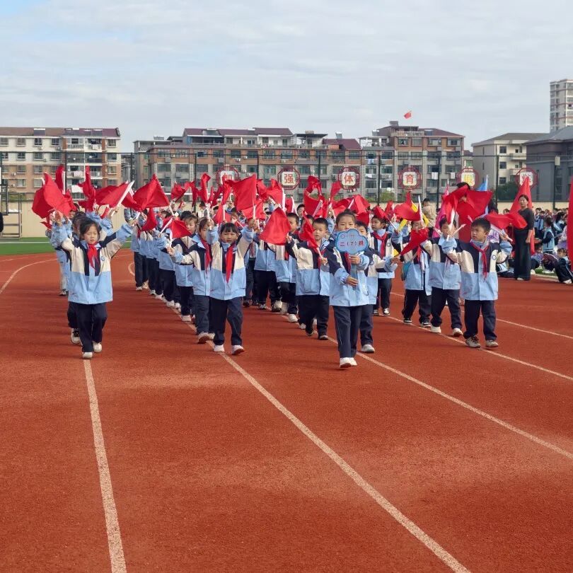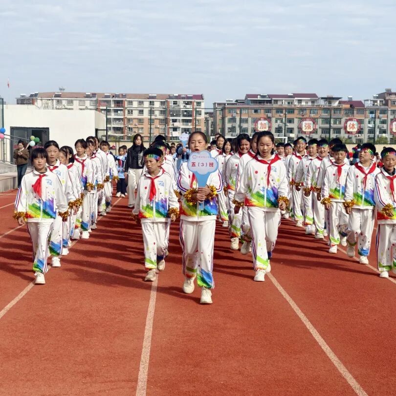 伴着激昂的运动员进行曲,入场仪式正式开始。各班方队依次亮相,他们穿着整齐服装,高举方阵旗帜,矫健的步履踏在运动场,彰显着五小师生昂扬向上的精神风貌。
