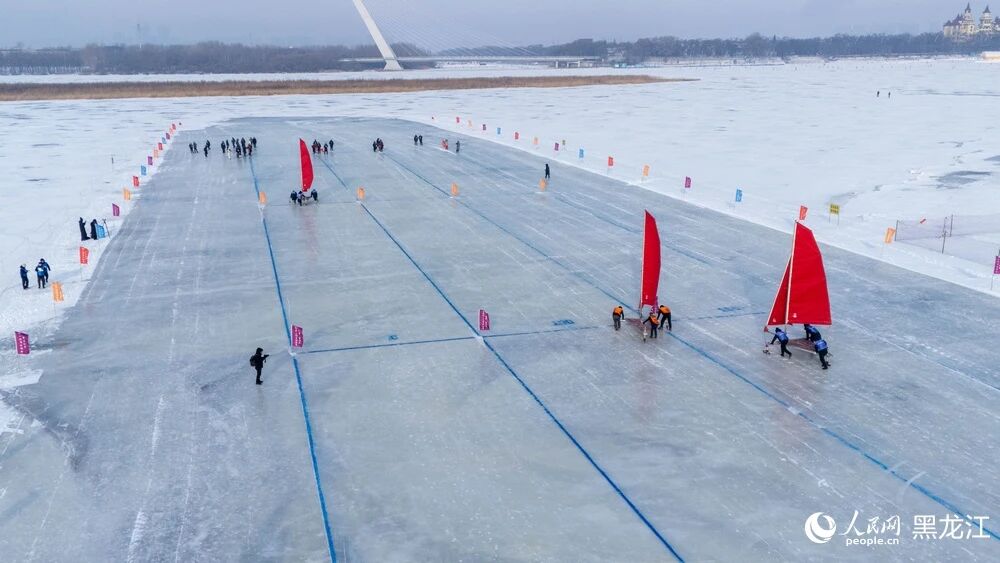 在松花江冰面上你追我赶、“乘风破浪”