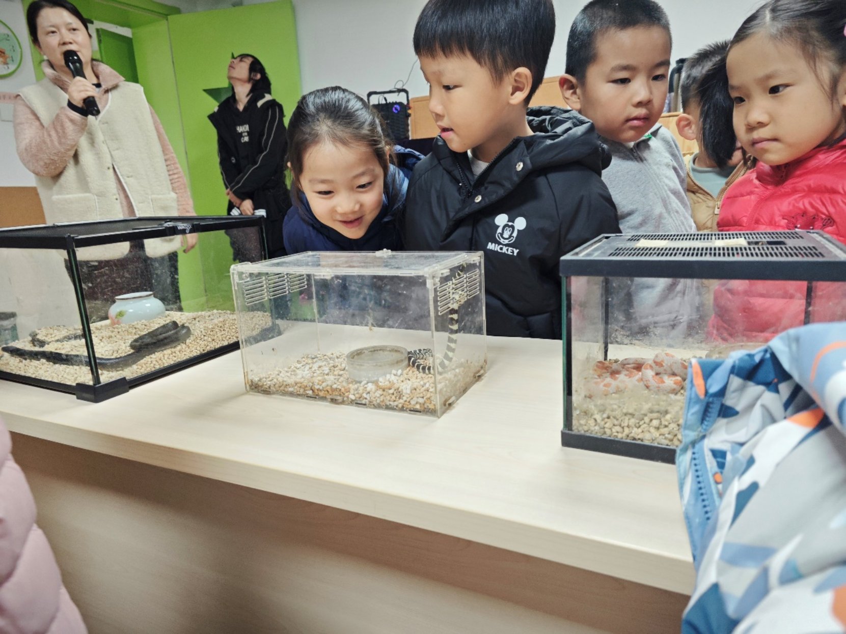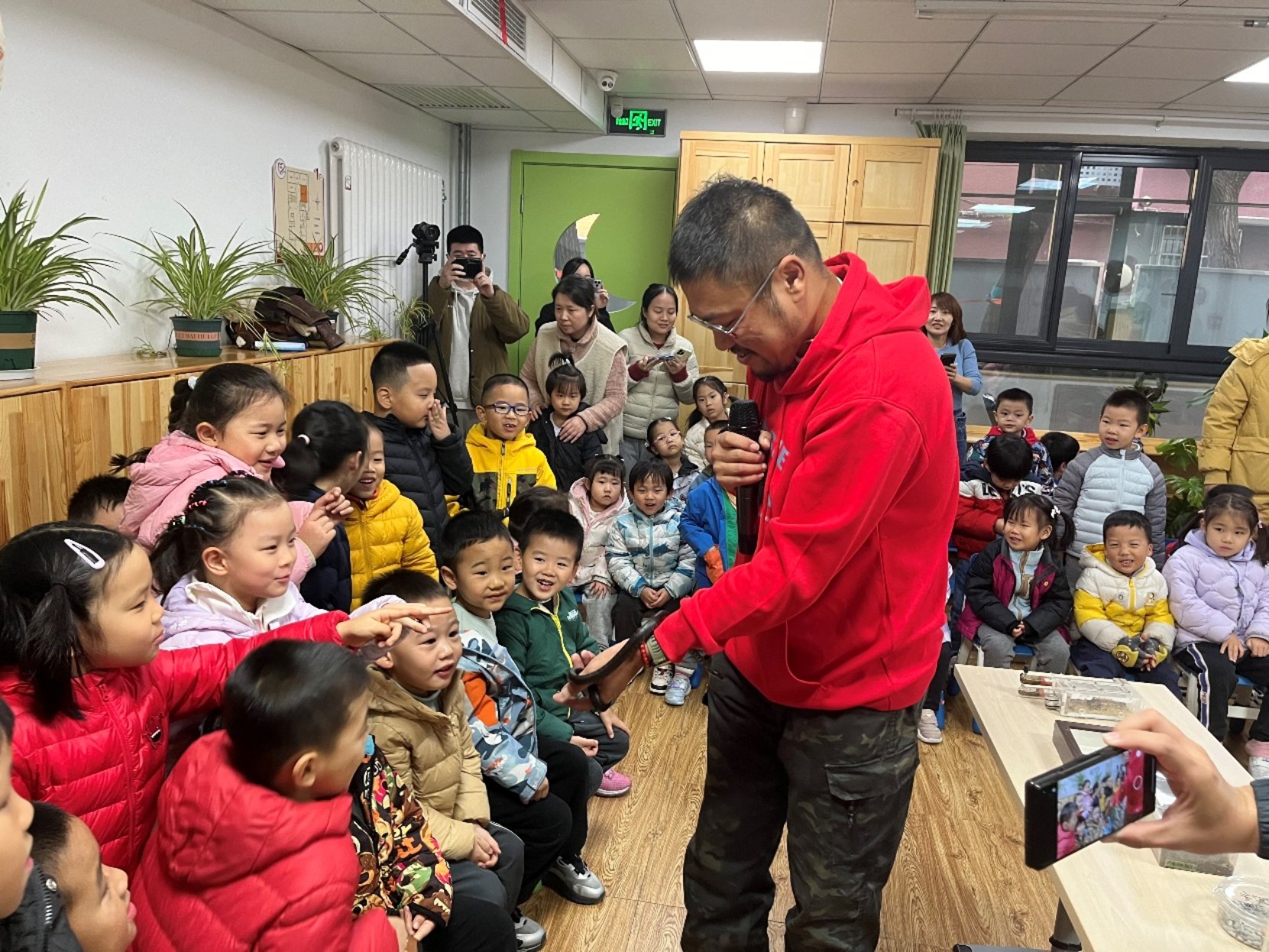 洁民幼儿园的教室里,户外生存专家孙靖伟为现场的孩子们展示了带来的昆虫、爬行动物的标本及活体。孩子们轮流有序地参观孙老师带来的蝎子标本,日本弓背蚁、幼体黑王蛇(无毒)等活体动物,引起孩子们阵阵惊叹,一部分孩子还挥手与动物们打招呼。随后,在孙老师的全程监督下,孩子们轻触幼体黑王蛇的表皮,感受实际的生命触动。这种多感官联动式学习,使抽象的生物知识转化为可触摸的生命体验,实现了勇气与知识的双向奔赴。