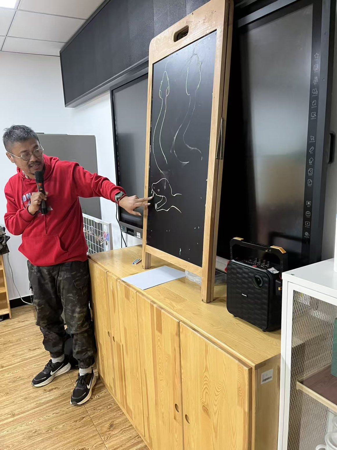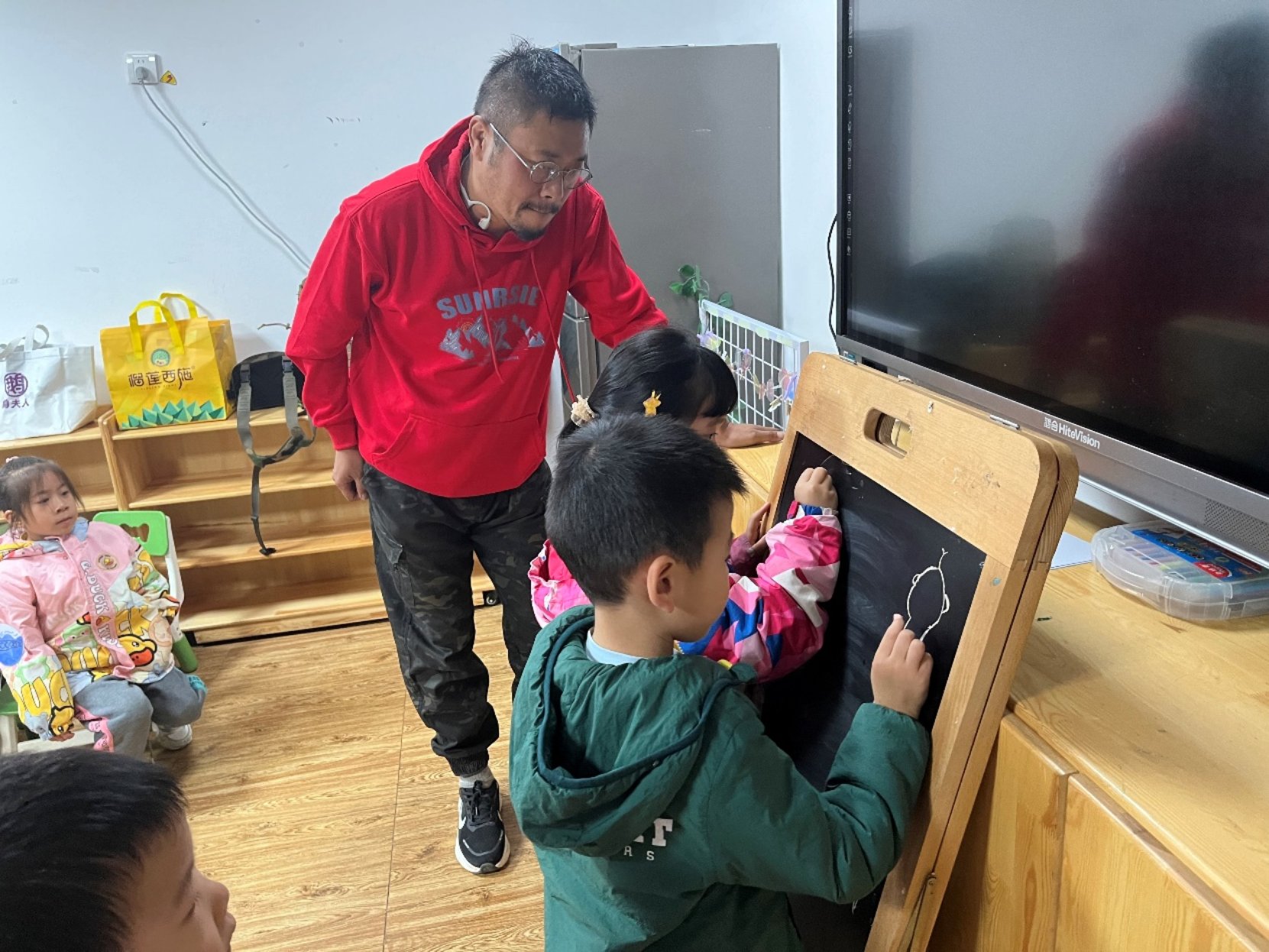 在孩子们完成观察后,孙老师用生动的比喻向孩子们讲解这些动物的身体形态和生存习性,并用绘画教会孩子们如果在户外遇到蛇如何分辨是否为毒蛇的技巧。最后,孙老师邀请孩子们在黑板上对自己刚才观察到的内容进行绘画。通过“以画为媒”的互动模式,孙老师根据孩子们画作中呈现的动物查漏补缺,现场通过模型拆解进行强化认知。