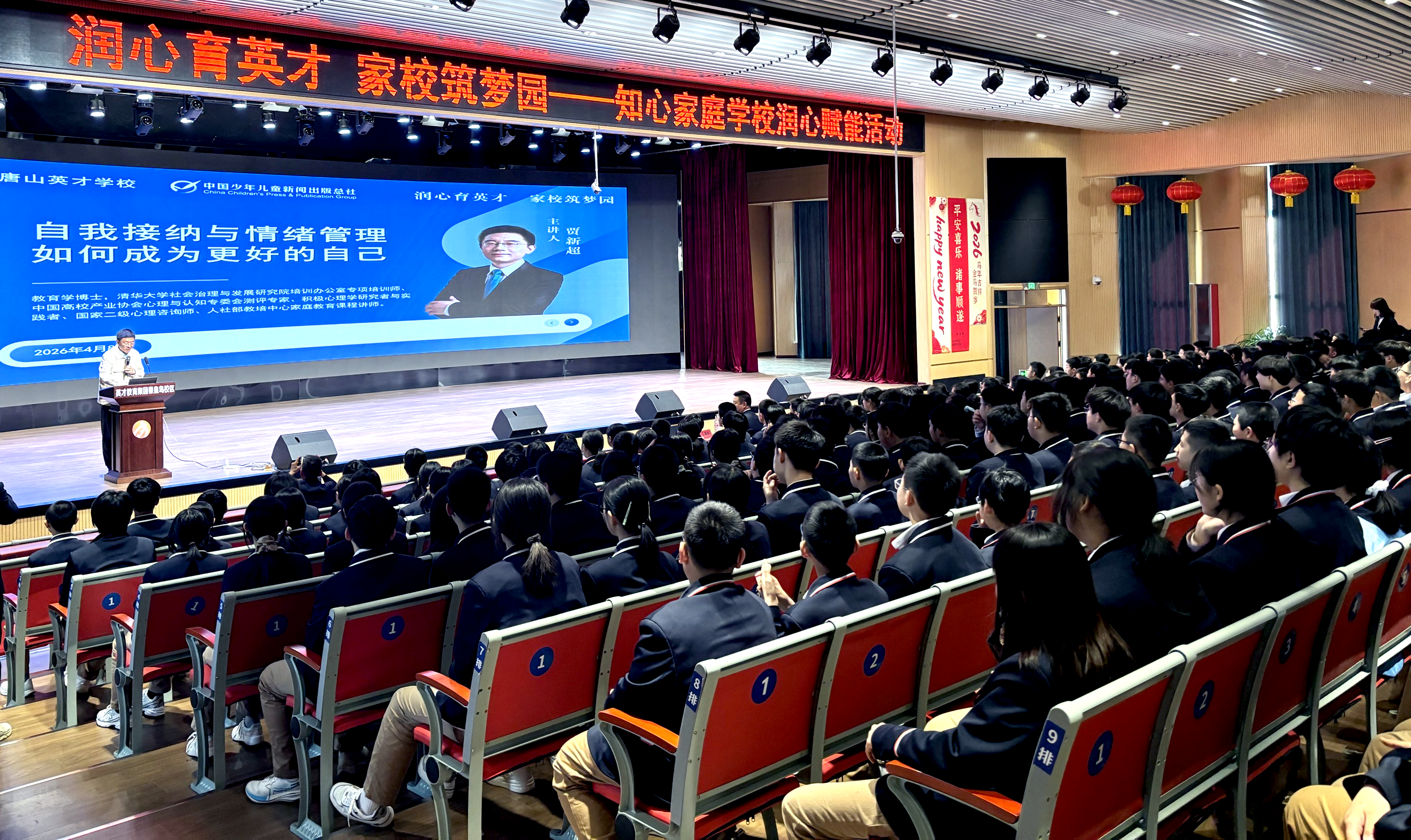 4月7日,一场以青少年积极心理健康为核心的心理辅导活动在河北唐山英才学校温暖开展。中国少年儿童新闻出版总社与唐山英才学校携手,特邀著名积极心理学研究者与实践者、清华大学贾新超博士亲临指导。以青少年心理健康为主题,聚焦成长困境、破解情绪难题、激活内在动力,通过专题辅导的形式,为青少年的健康成长筑牢坚实心理根基。